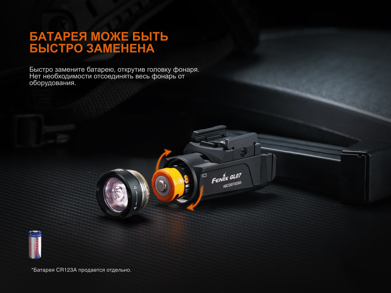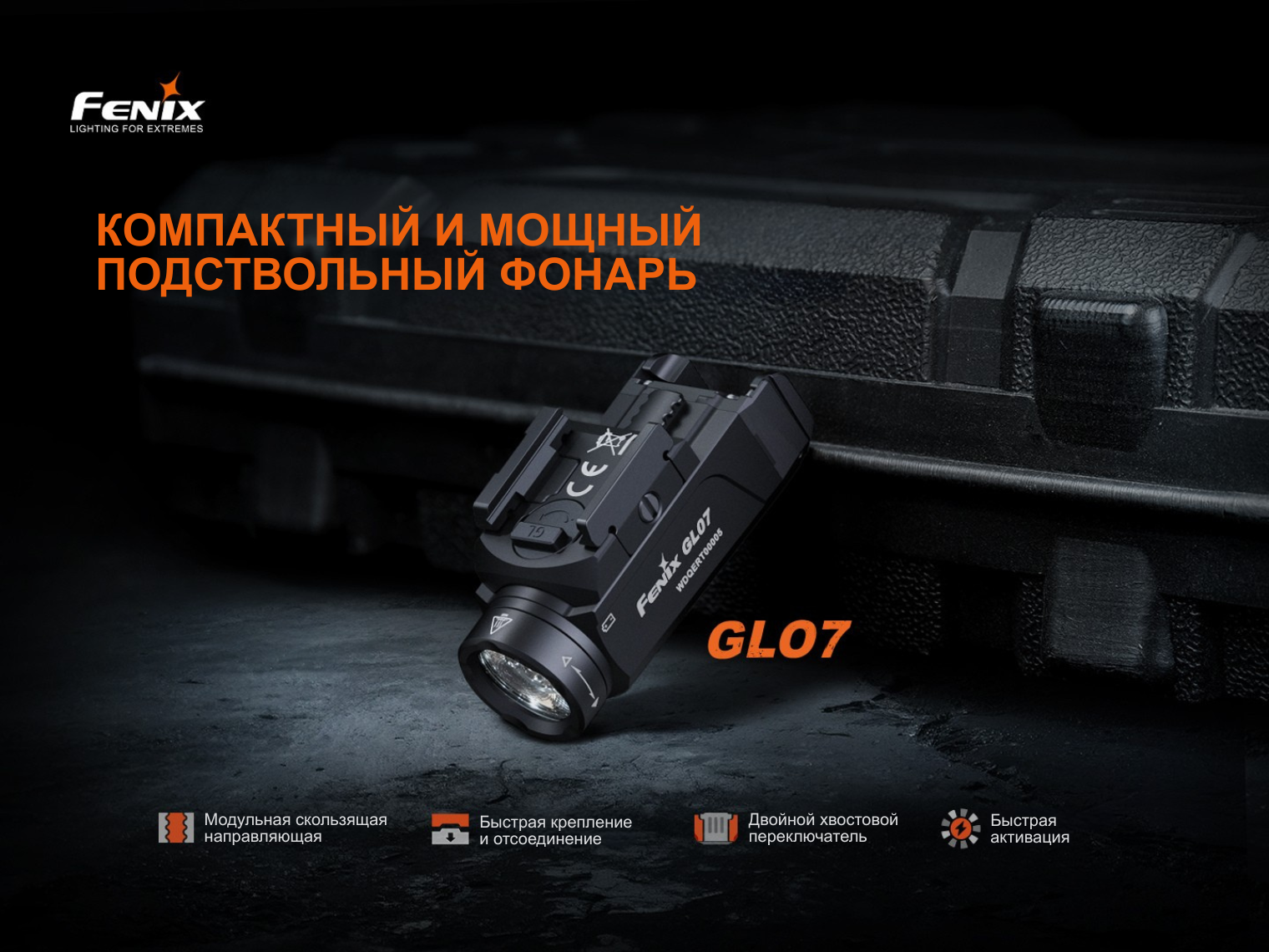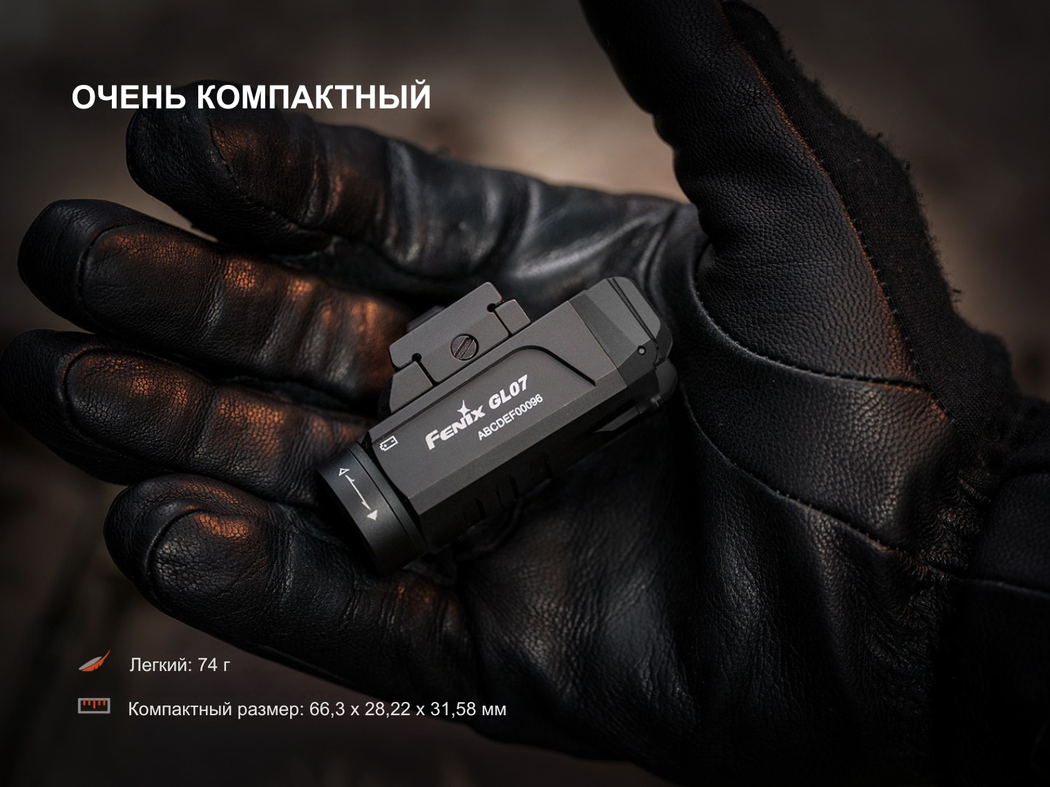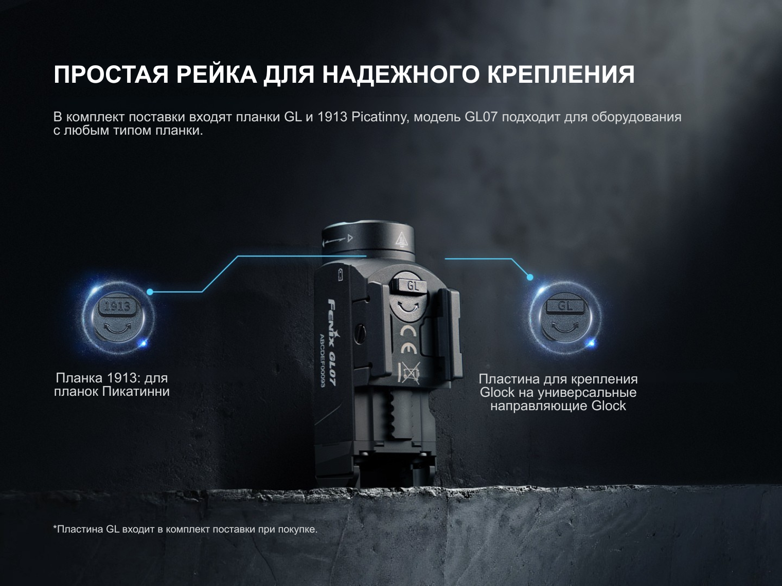 Фонарь Fenix GL07 оснащен универсальным быстросъемным креплением, совместимым с планками Glock и Picatinny. Модульная база с подвижными направляющими позволяет быстро адаптировать положение устройства под разные модели оружия — от полноразмерных до компактных пистолетов, таких как Springfield Hellcat.