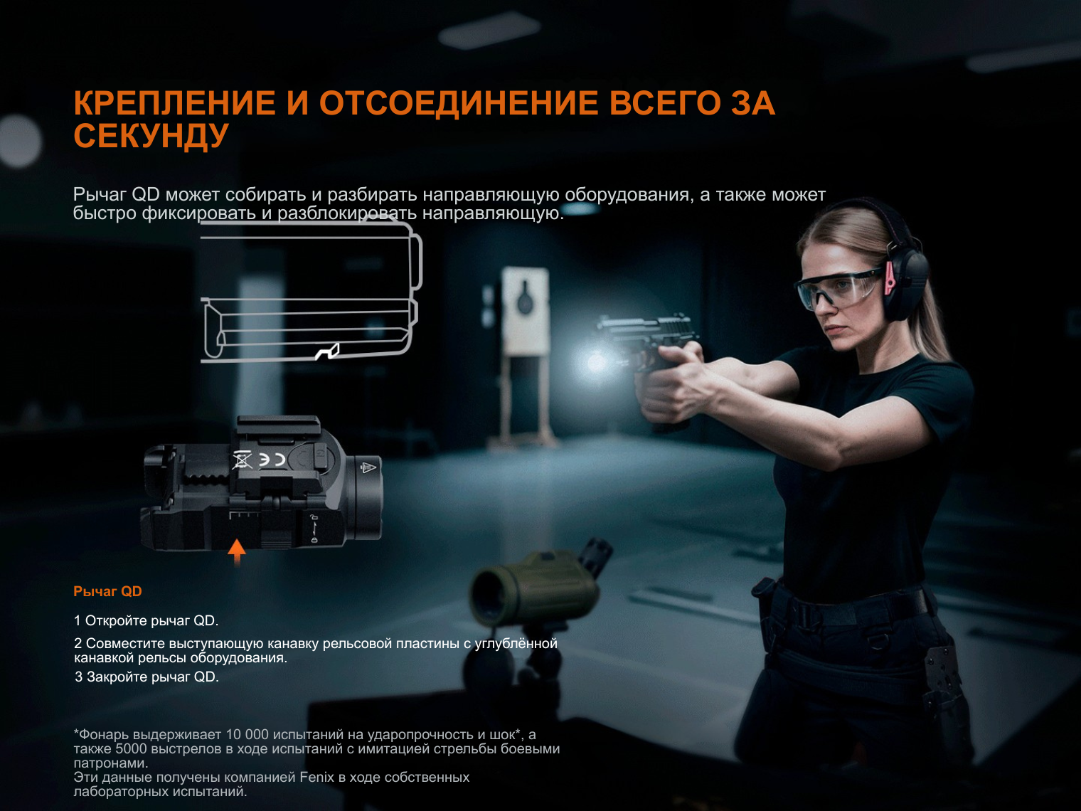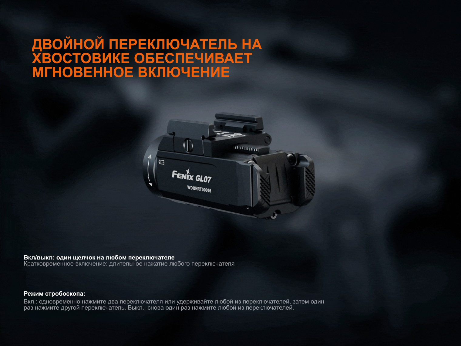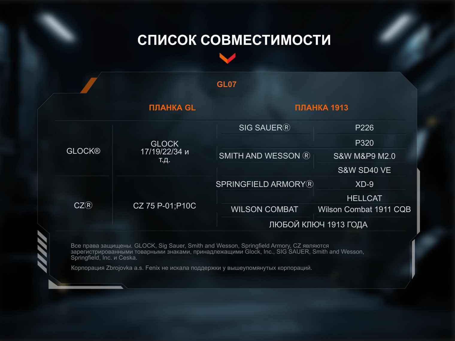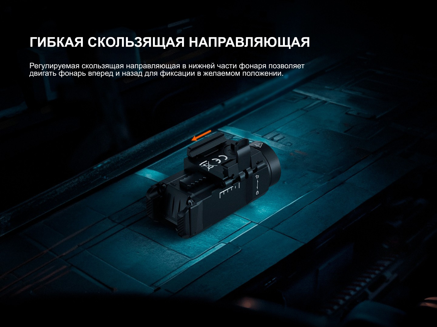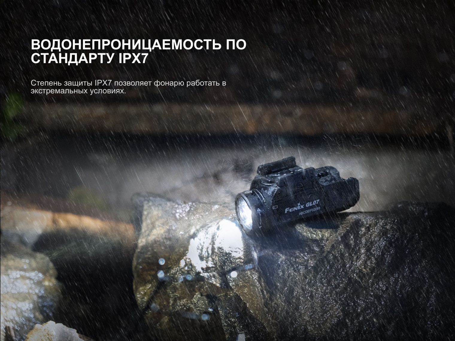 Фонарь Fenix GL07 оснащен универсальным быстросъемным креплением, совместимым с планками Glock и Picatinny. Модульная база с подвижными направляющими позволяет быстро адаптировать положение устройства под разные модели оружия — от полноразмерных до компактных пистолетов, таких как Springfield Hellcat.