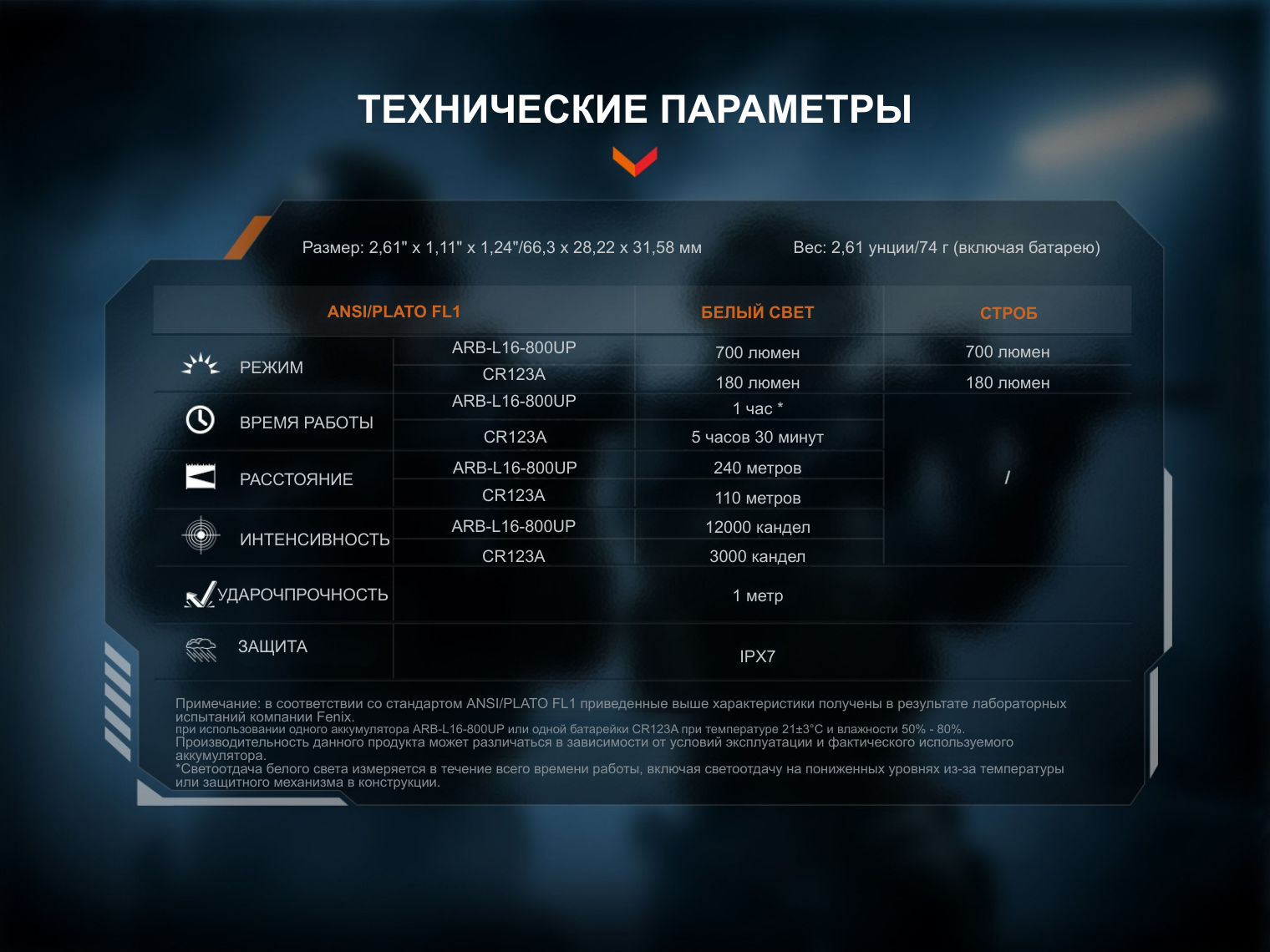 - источник питания – 1 х 16340 / 1 x CR123A;