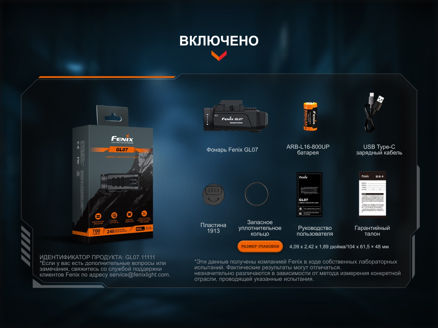 Фонарь Fenix GL07, аккумулятор ARB-L16-800UP, адаптер для 1913, зарядный кабель USB-C, запасное уплотнительное кольцо, инструкция пользователя, гарантийный талон.