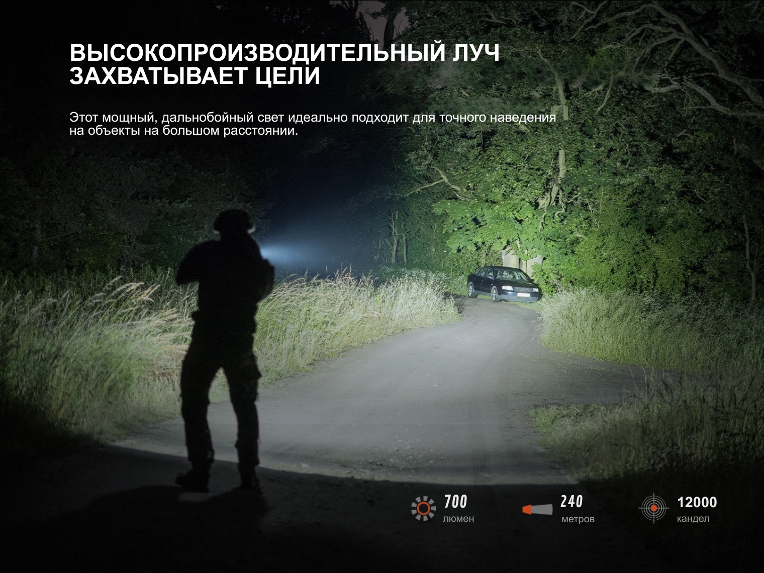 В качестве источника света используется светодиод Luminus SFT12R с цветовой температурой ~6000K — это холодный белый свет с высокой контрастностью, что делает подсветку мельчайших деталей предельно четкой. Максимальная яркость луча достигает 700 люмен, а дальность — до 240 м.