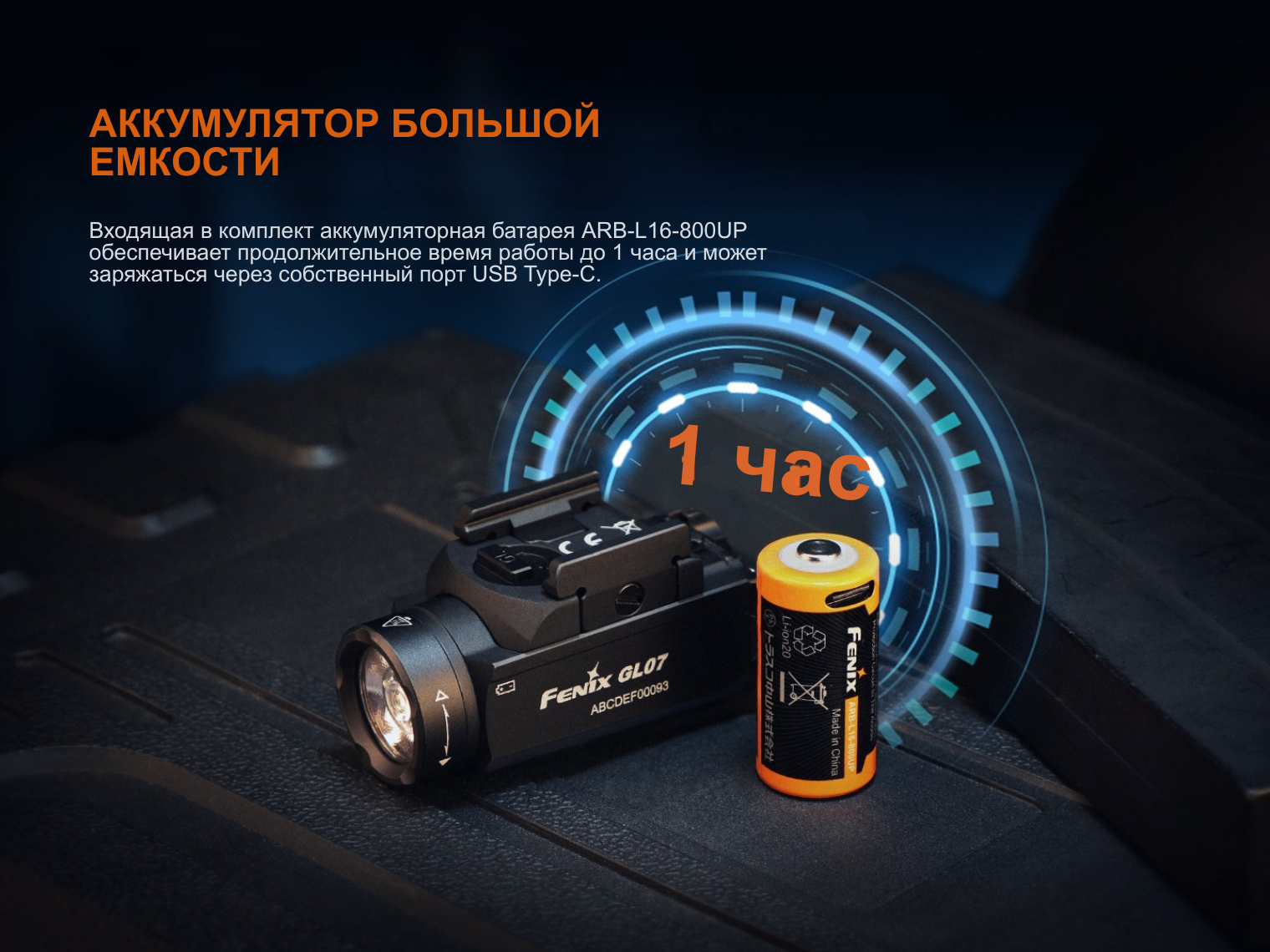 Комплектация | Fenix GL07, аккумулятор ARB-L16-800UP, адаптер для 1913, зарядный кабель USB-C, запасное уплотнительное кольцо, инструкция |