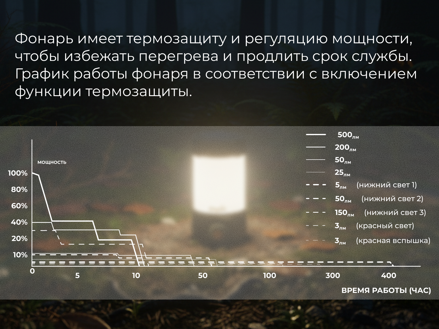 Можно комбинировать между собой режимы из групп А и Б. Для этого сначала необходимо прокрутить вращающийся переключатель, затем нажать и удерживать кнопку — таким образом одновременно активируется нижнее освещение и на 360°. После этого с помощью пошагового вращения переключателя и коротких кликов кнопки можно задавать требуемую яркость каждого из типов света.