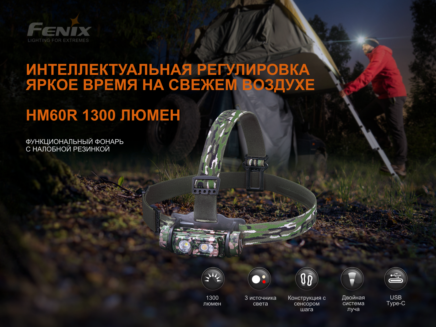 Fenix HM60R Camo — лимитированное профессиональное снаряжение для задач в полевых условиях. Камуфляжная расцветка корпуса и ленты разработана для военных и спецподразделений, где критически важно сохранять маскировку на фоне профессиональной экипировки. Мощность 1300 лм, три типа света и интеллектуальный сенсор частоты шага обеспечивают максимальную эффективность и незаметность в дикой природе.
