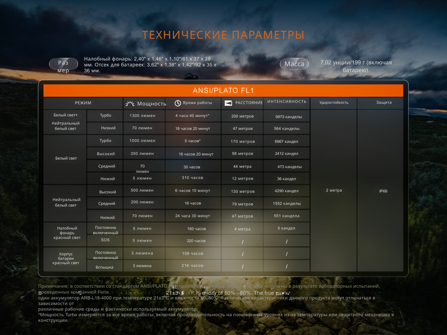 - Турбо: 1300 лм – 9973 кд – 4 ч 40 мин – 200 м;