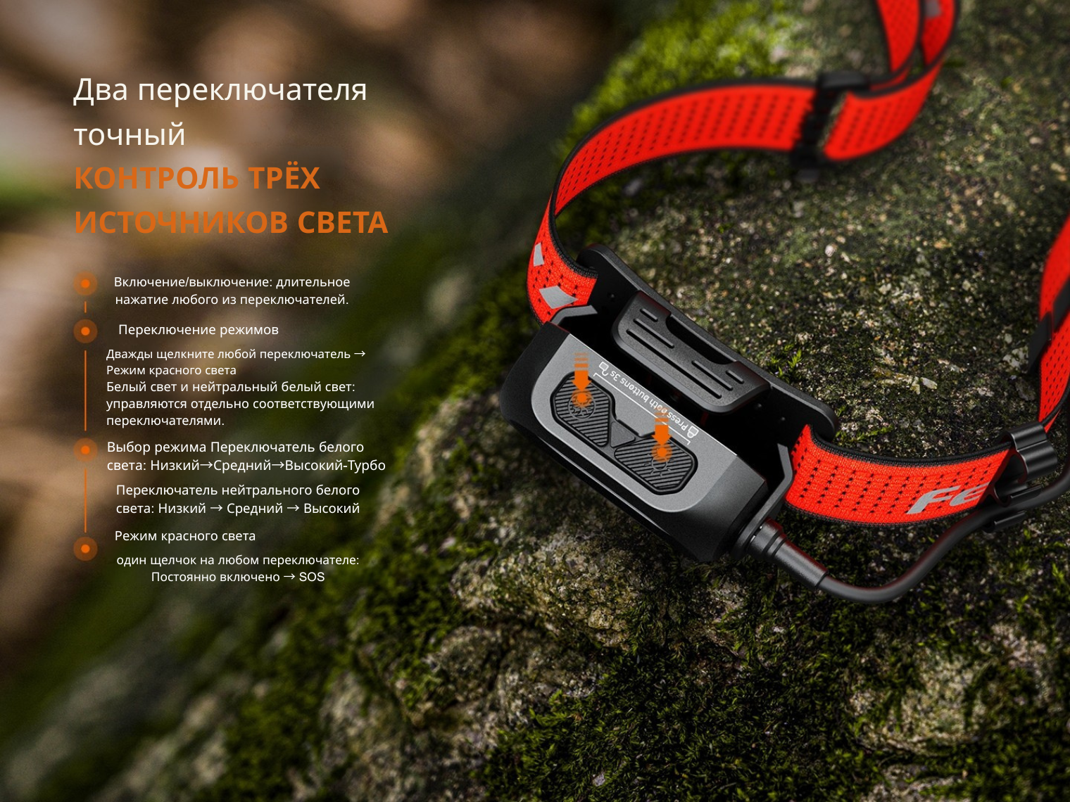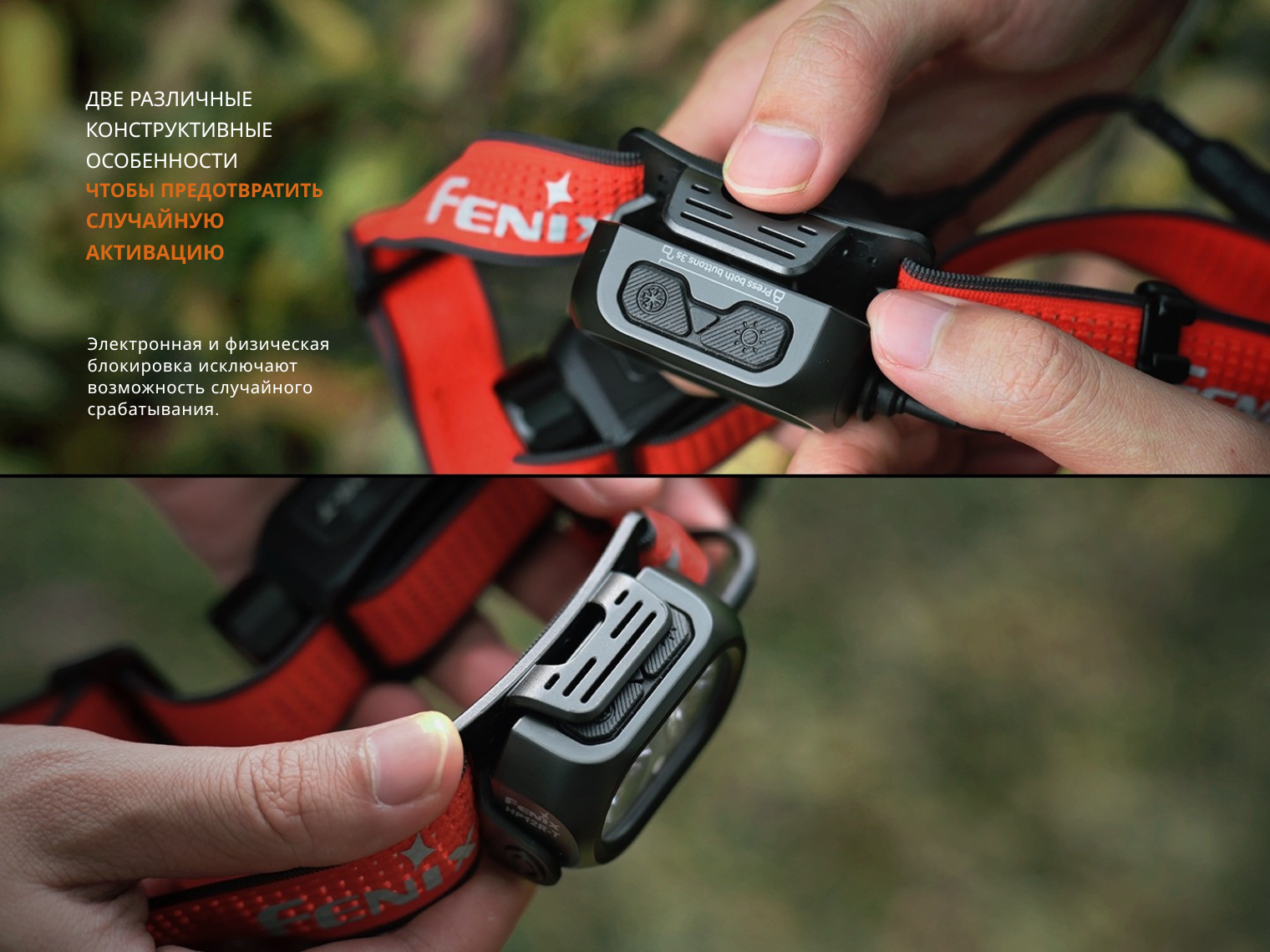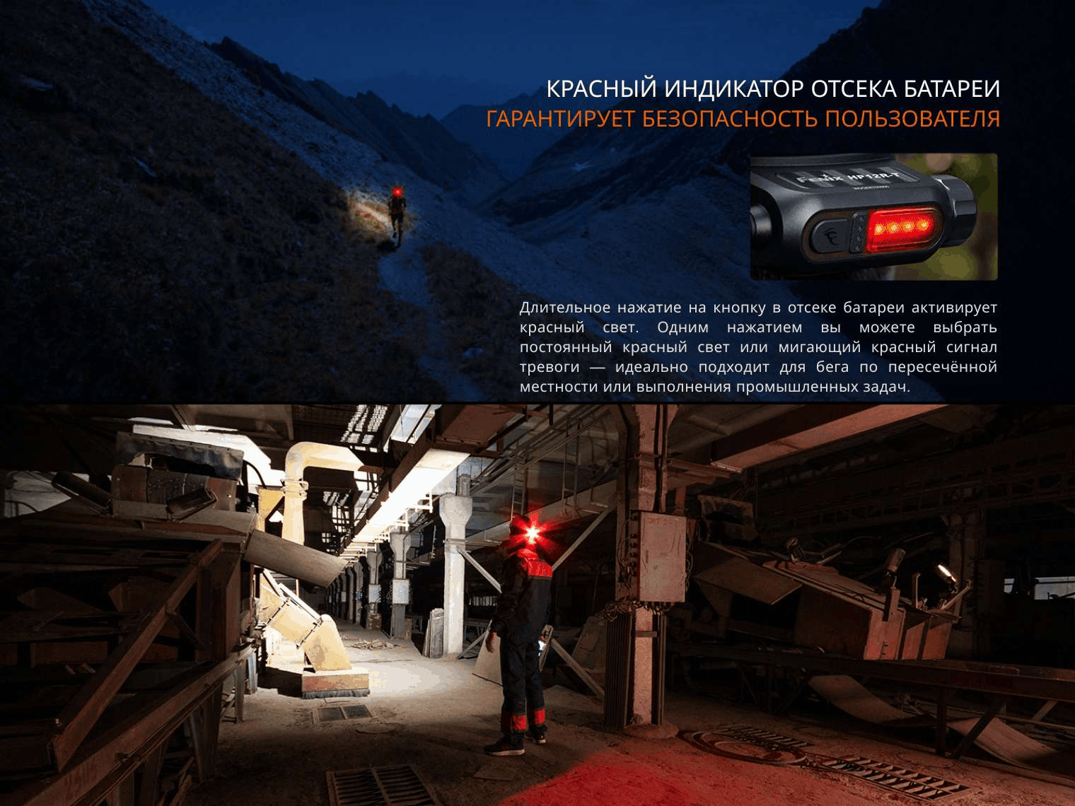 Главная особенность Fenix HP12R-T — батарейный блок, вынесенный на заднюю часть налобного крепления. Такое решение позволяет сбалансировать вес между корпусом фонаря и батарейным отсеком, предотвращая скольжение конструкции на голове во время активного движения.