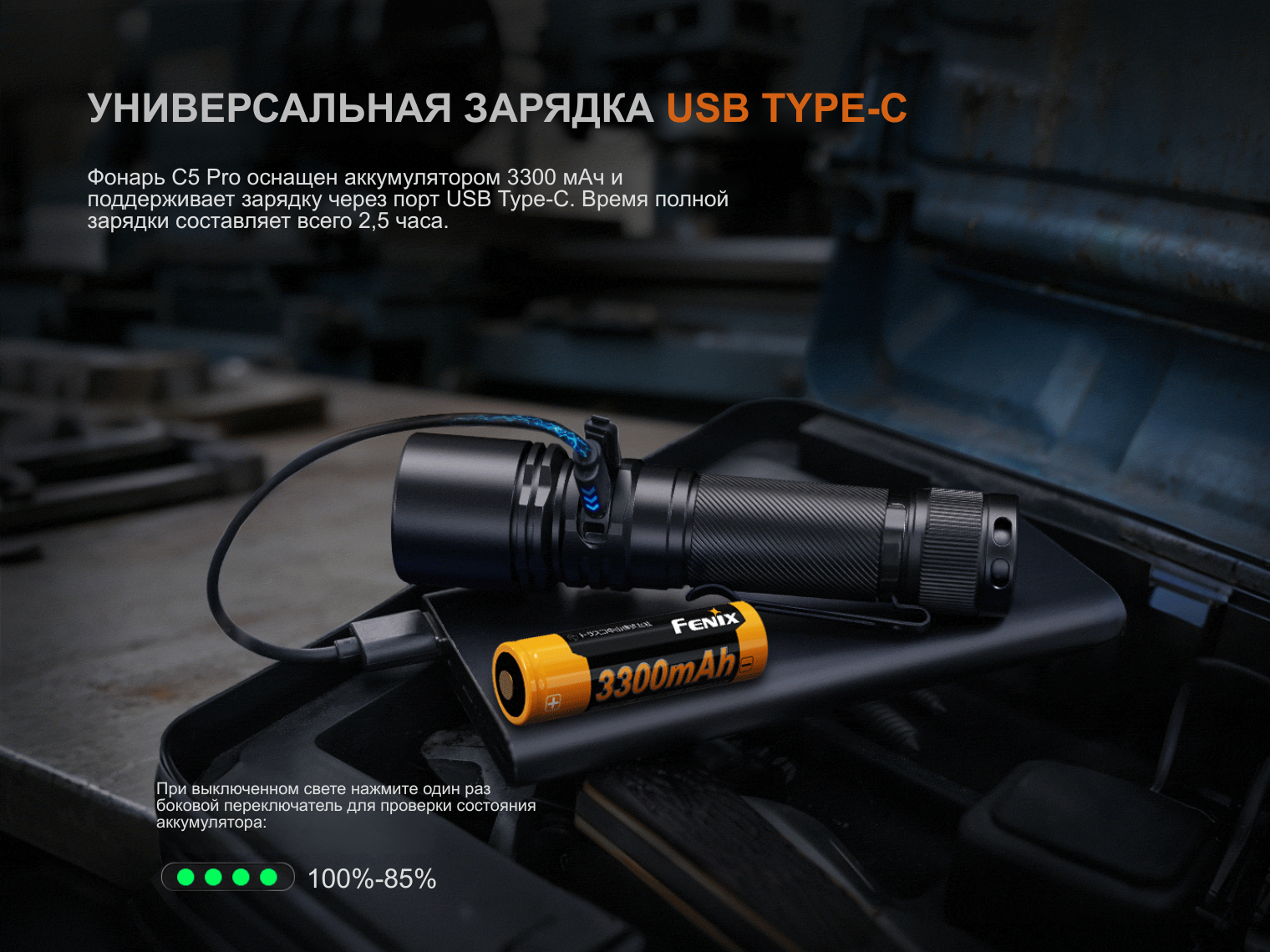 Fenix C5 Pro работает от Li-ion аккумулятора 18650 емкостью 3300 мАч (ARB-L18-3300 в комплекте). Также фонарь совместим с двумя литиевыми батарейками CR123A. Зарядка происходит через интегрированный порт USB Type-C под надежной защитной заглушкой.