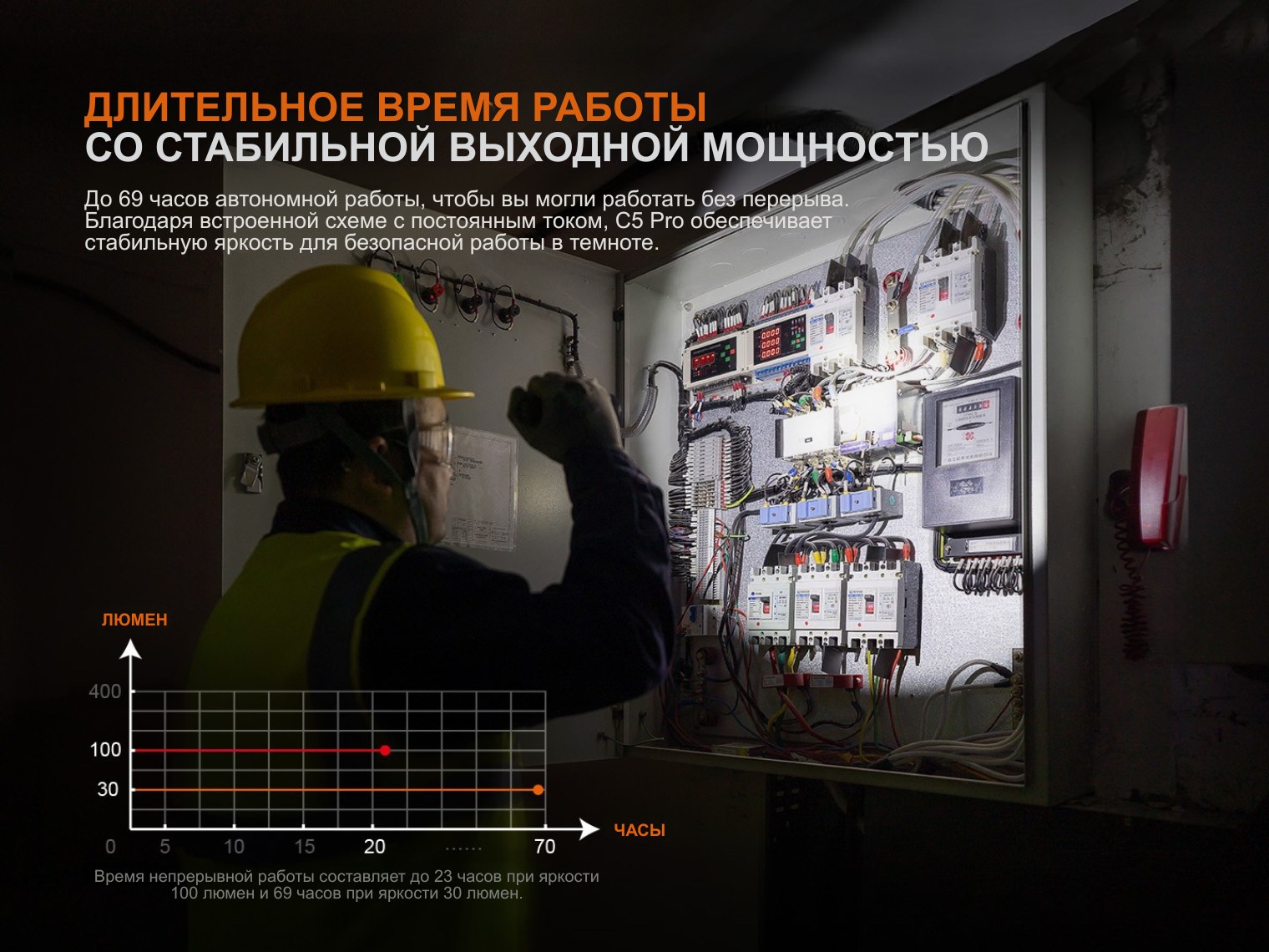 Обратите внимание! В режиме Турбо время работы указано суммарно, учитывая снижение яркости при срабатывании системы защиты от перегрева.