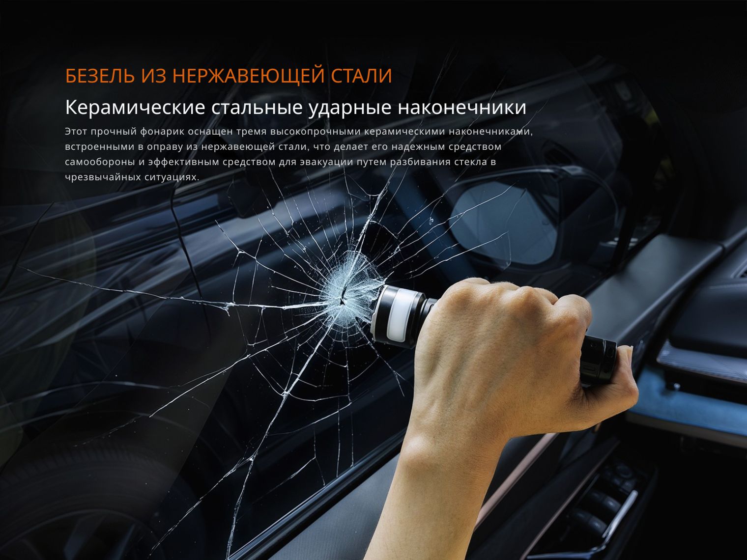 Корпус изготовлен из антикоррозионного сплава алюминия A6061-T6 и дополнен стальным безелем с керамическими наконечниками для разбивания стекол и защиты во время самообороны. Глубокие ребра под головой конструкции отвечают за отведение накопленного электроникой тепла. Мелкая накатка на рукояти препятствует скольжению ладони.