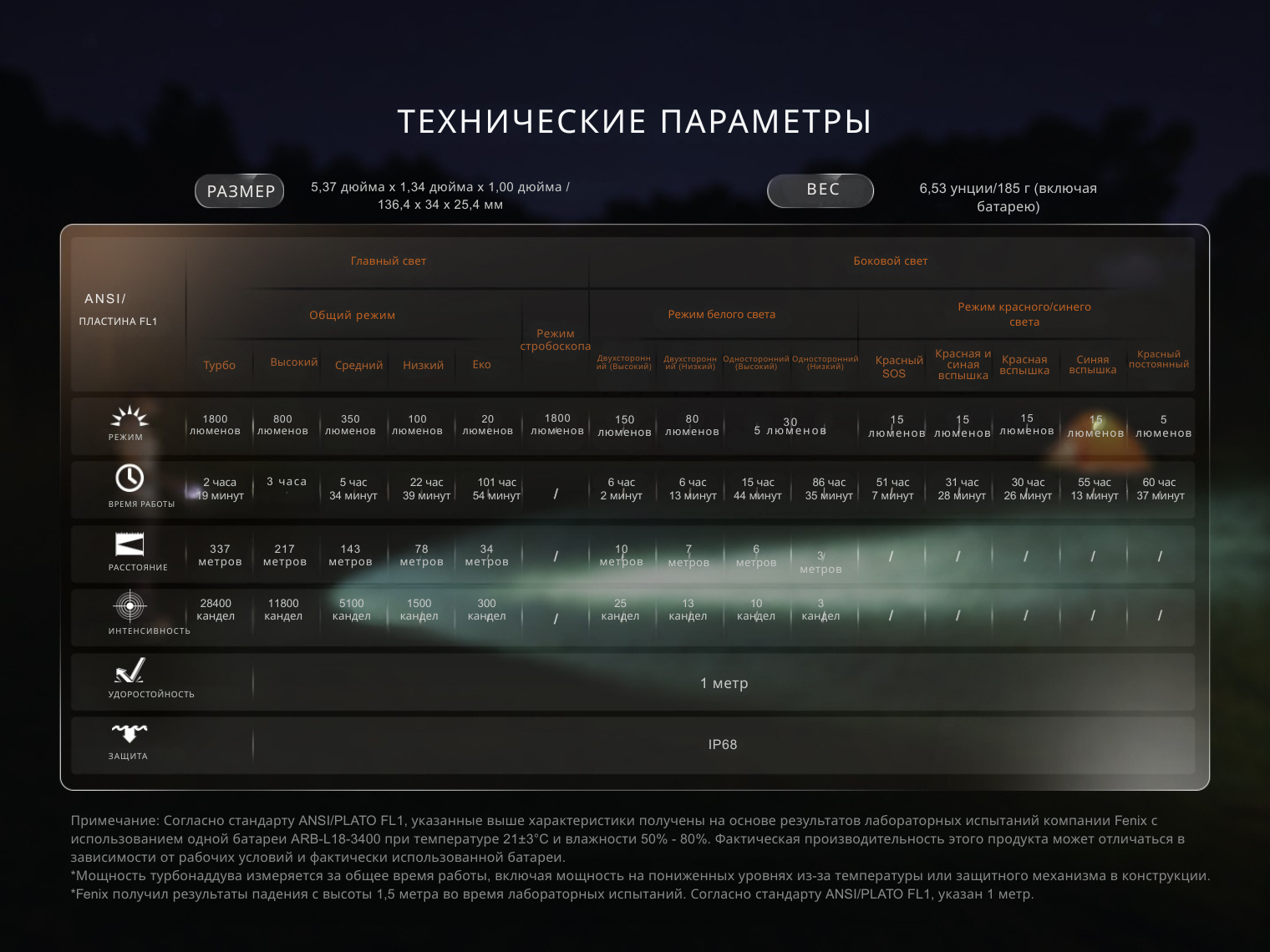 Обратите внимание! Данные о времени работы в режиме Турбо указаны с учетом времени работы в режимах с более низкой яркостью. Фонарь автоматически снижает мощность, когда срабатывает защита от перегрева.