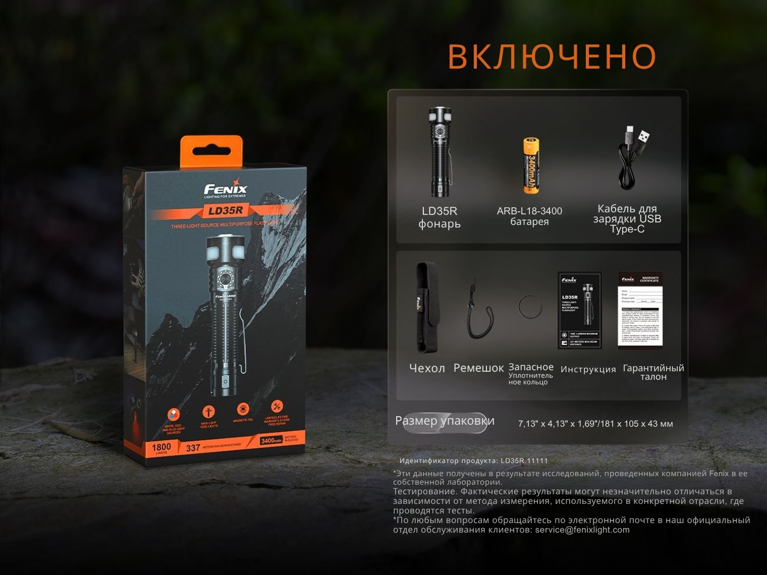 Фонарь Fenix LD35R, аккумулятор ARB-L18-3400, кабель USB-C для зарядки, запасное уплотнительное кольцо, темляк, чехол на пояс, инструкция пользователя, гарантийный талон.