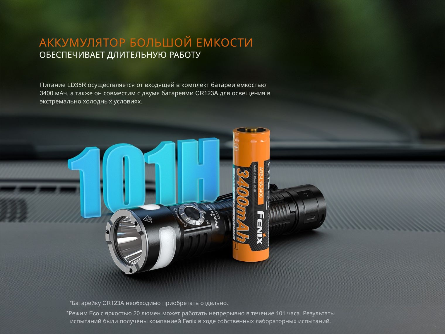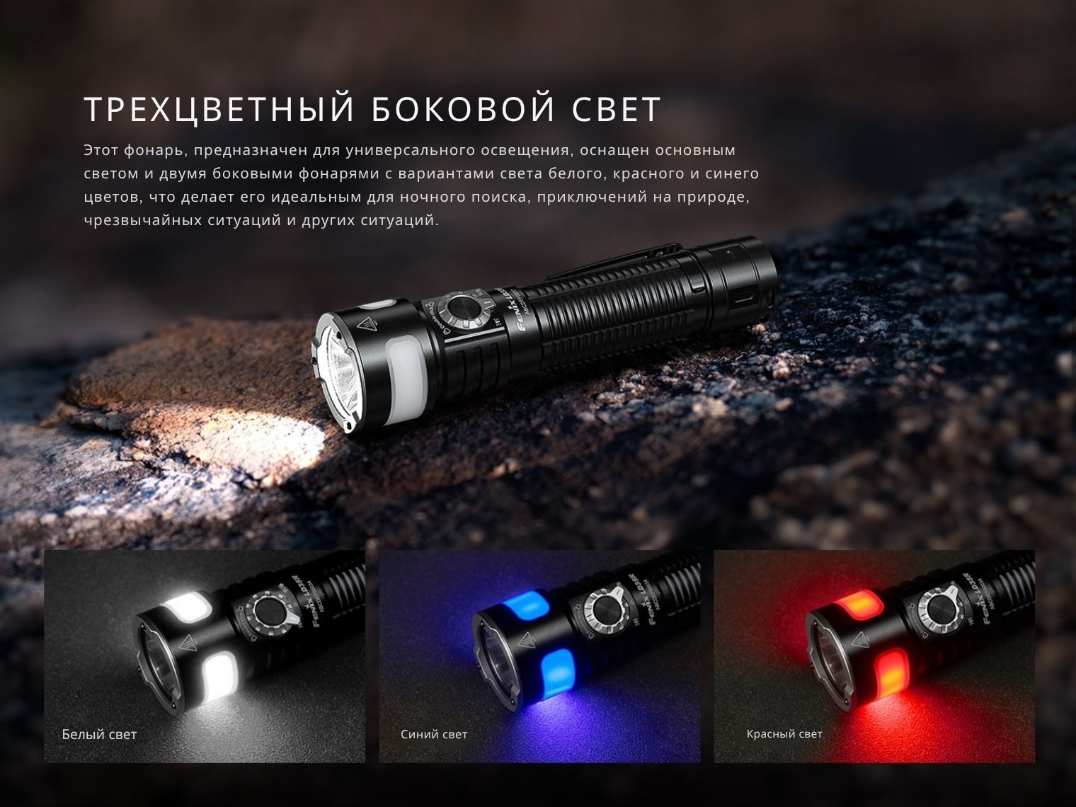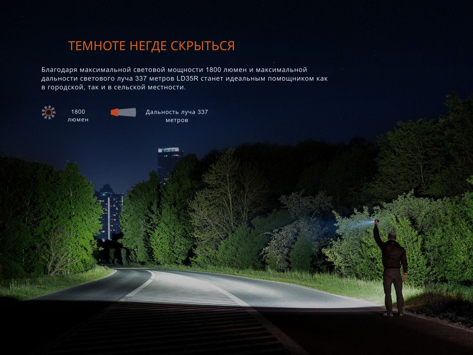 Фонарь Fenix LD35R может генерировать не только направленный вперед белый свет яркостью до 1800 люмен, но и мягкую боковую подсветку в 3 оттенках (белая, красная, синяя). Интерфейс включает 15 режимов. Питание от аккумулятора 18650 с возможностью зарядки прямо в корпусе фонаря через порт USB-C. Герметичный корпус из алюминия дополнен стальным безелем с керамическими наконечниками, магнитом в хвосте и съемной клипсой.