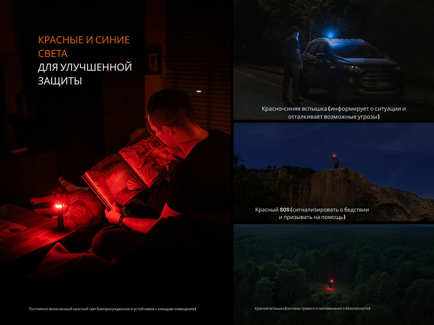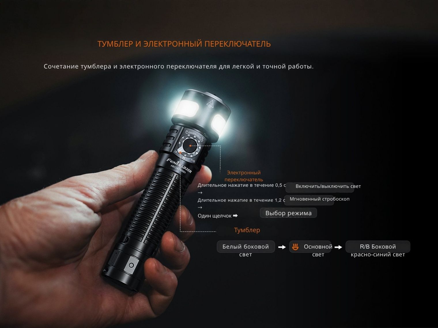 В Fenix LD35R доступны 15 режимов, поделенных на группы: классическое переднее освещение и боковой свет.