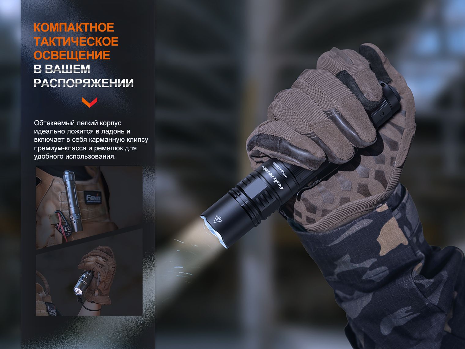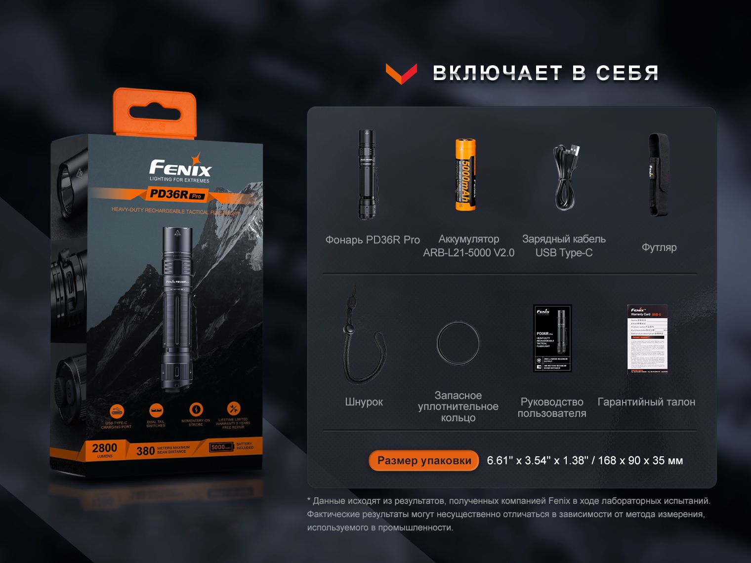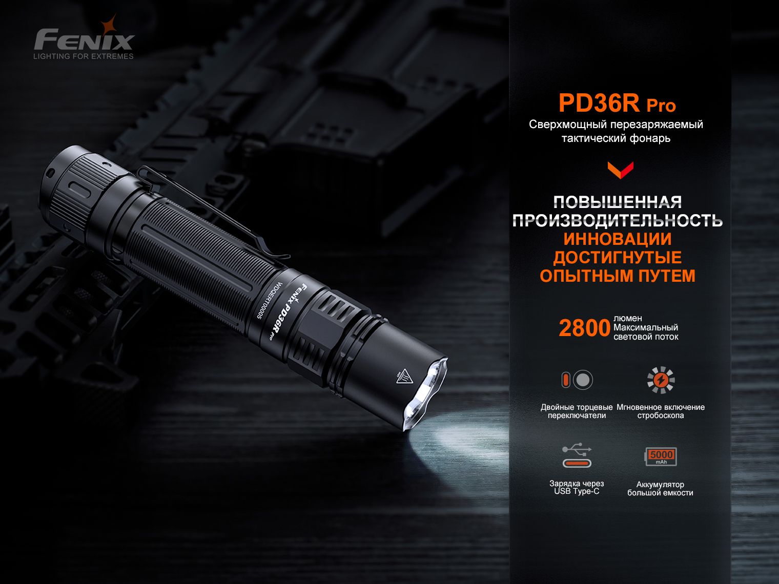 Fenix PD36R Pro – фонарь нового поколения, который относится к тактическому типу. Модель запрограммирована на 6 режимов работы с максимальной яркостью 2800 люмен и дальнобойностью луча 380 метров. За освещение отвечает светодиод Luminus SFT70, а за питание – Li-ion аккумулятор Fenix ARB-L21-5000 V2.0 с возможностью подзарядки с помощью кабеля из комплекта.