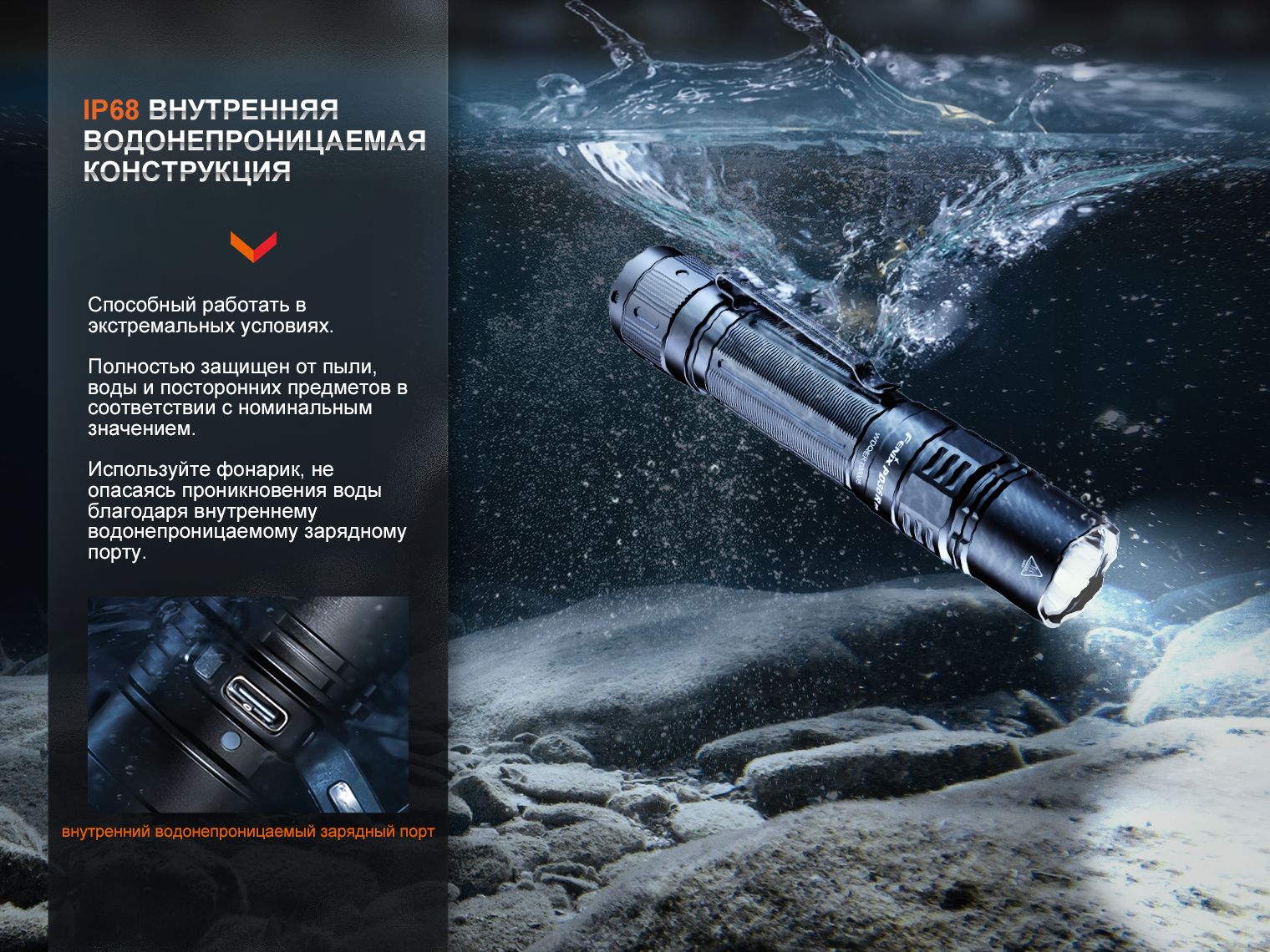 Корпус изготовлен из износостойкого алюминиевого сплава А6061-Т6, который отличается прочностью и стойкостью к механическим воздействиям. Металл не деформируется во время ударов и гарантирует защиту внутренней электроники в случае падения фонаря с высоты порядка 1.5 метров. Корпус обладает полной герметичностью – об этом говорит класс влагозащиты IP68, позволяющий многократно погружать устройство под воду без угрозы для его работоспособности.