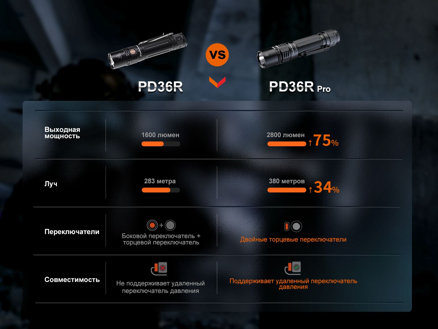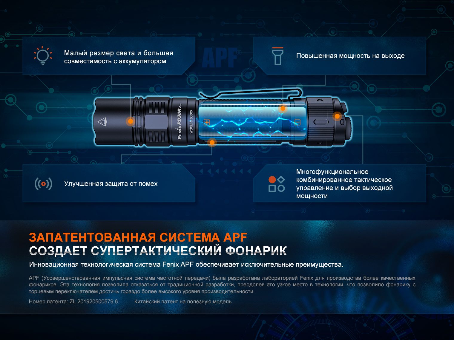 Фонарь Fenix PD36R Pro является усовершенствованной версией Fenix PD36R и отличается впечатляющей яркостью света до 2800 люмен, что почти в 2 раза превышает мощность базовой модели. Устройство сконструировано на основе современной технологии Fenix APF (Advanced Pulse Frequency). Она дает возможность избежать ограничение тока без негативных последствий для срока службы внутренней электроники и увеличить производительность фонаря до максимума.