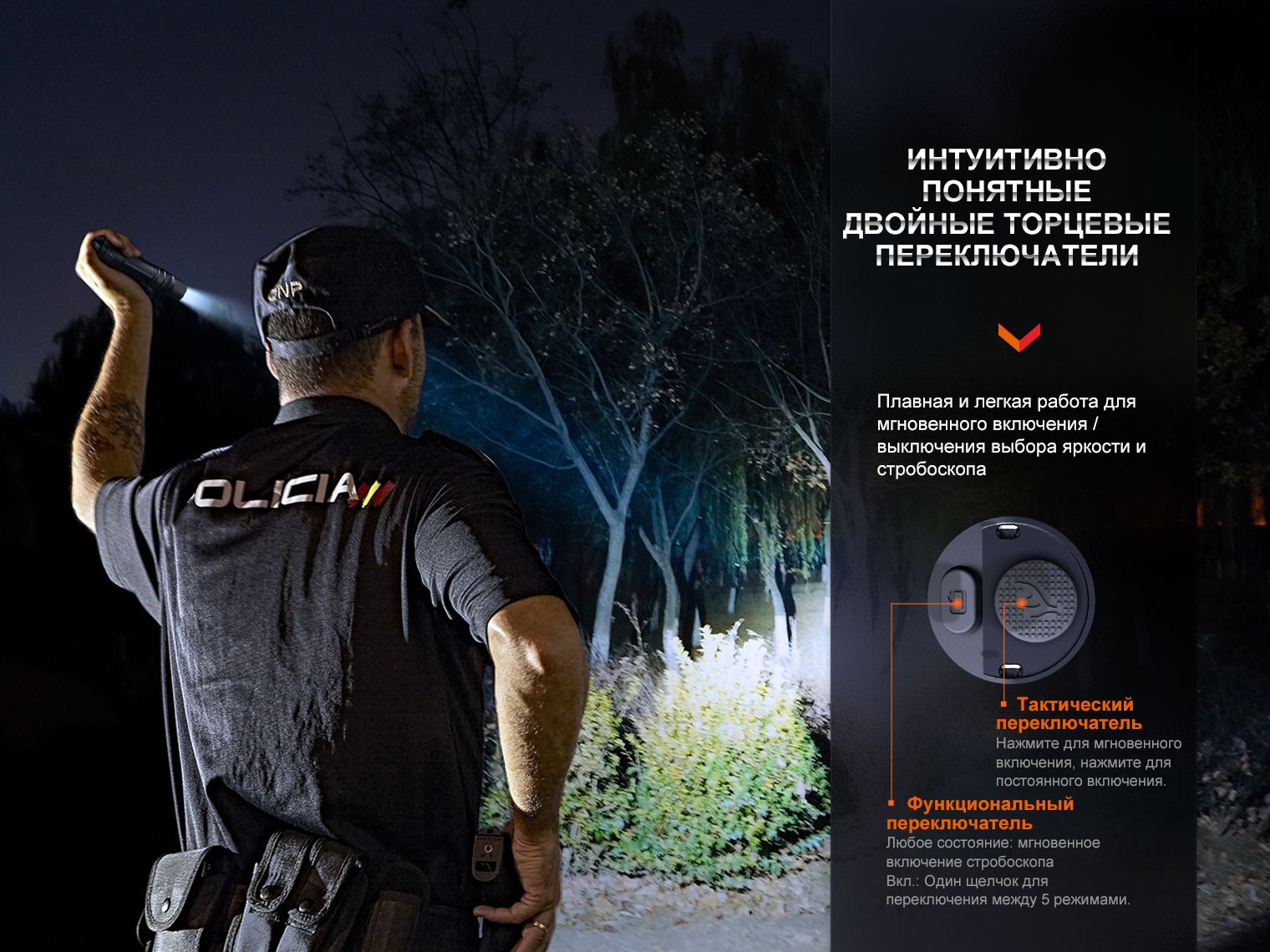 Для управления предназначена пара переключателей, которые находятся в хвостовой части корпуса. Кнопки имеют разный размер и поверхность, чтобы пользователь не путал их в темноте: тактический переключатель круглой формы с шероховатой поверхностью и гладкий функциональный переключатель в форме овала.