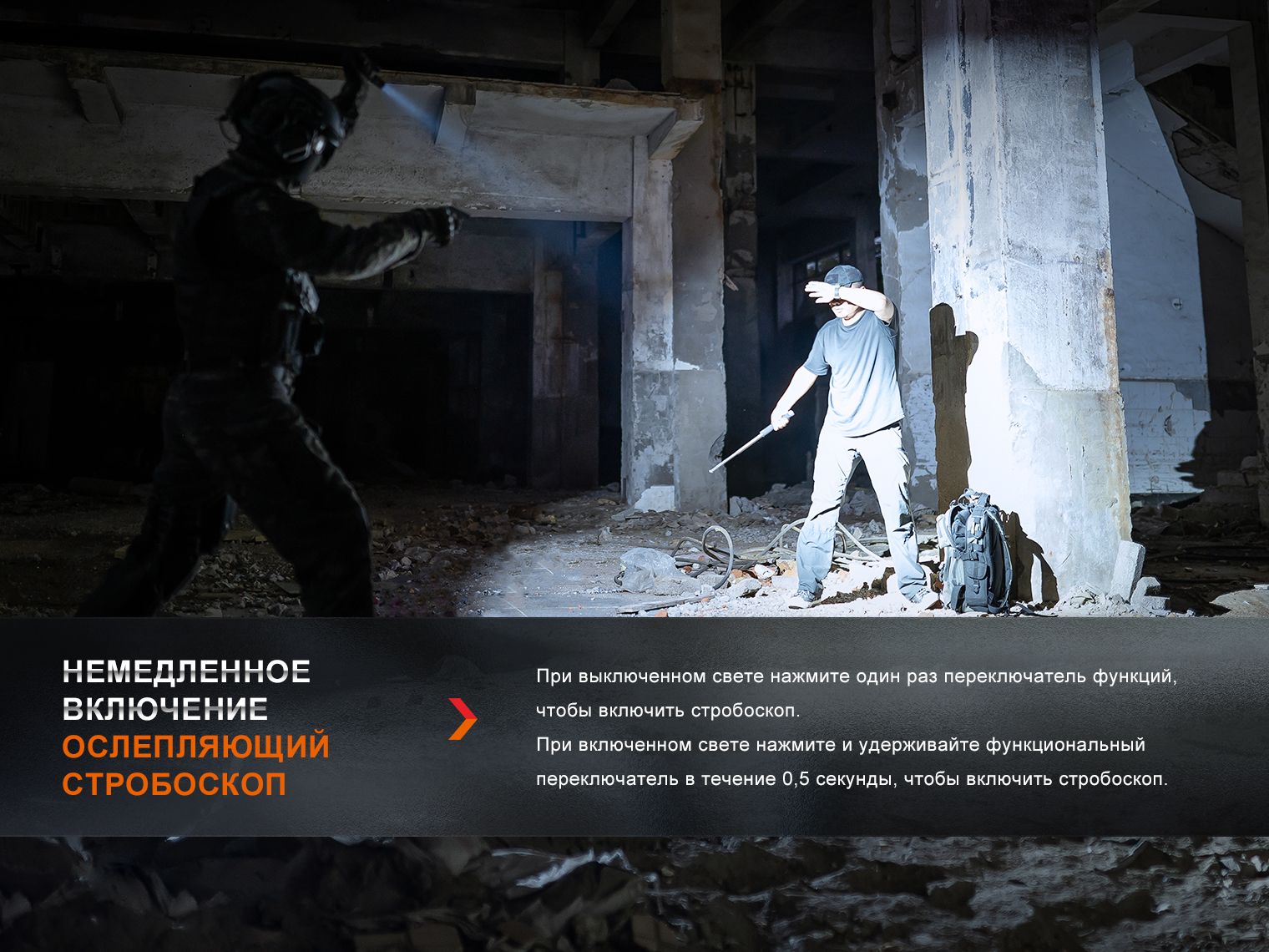 - Активация стробоскопа в постоянном режиме: зажатие функционального переключателя в течение 0.5 секунды. В случае повторного нажатия активируется режим с постоянным светом.
