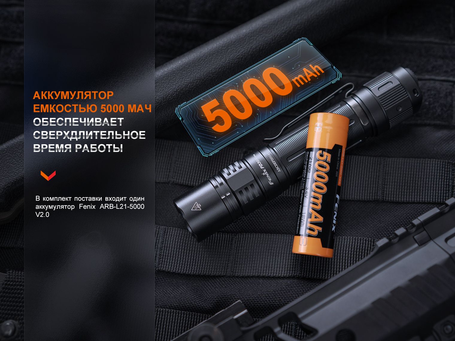 Белый светодиод Luminus SFT70 генерирует яркий свет дальнобойностью 380 метров. Ресурс работы диода составляет порядка 50 тысяч часов. За питание фонаря отвечает Li-ion аккумулятор форм-фактора 21700 – Fenix ARB-L21 V2.0 емкостью 5000 мАч. Подзарядка элемента питания осуществляется с помощью зарядного кабеля, который подсоединяется напрямую к корпусу со встроенным портом USB Type-C. Время зарядки составляет 3 часа. При необходимости аккумулятор из комплекта можно заменить на один из фирменных аккумуляторов: ARB-L21-5000U или ARB-L21-4000P.