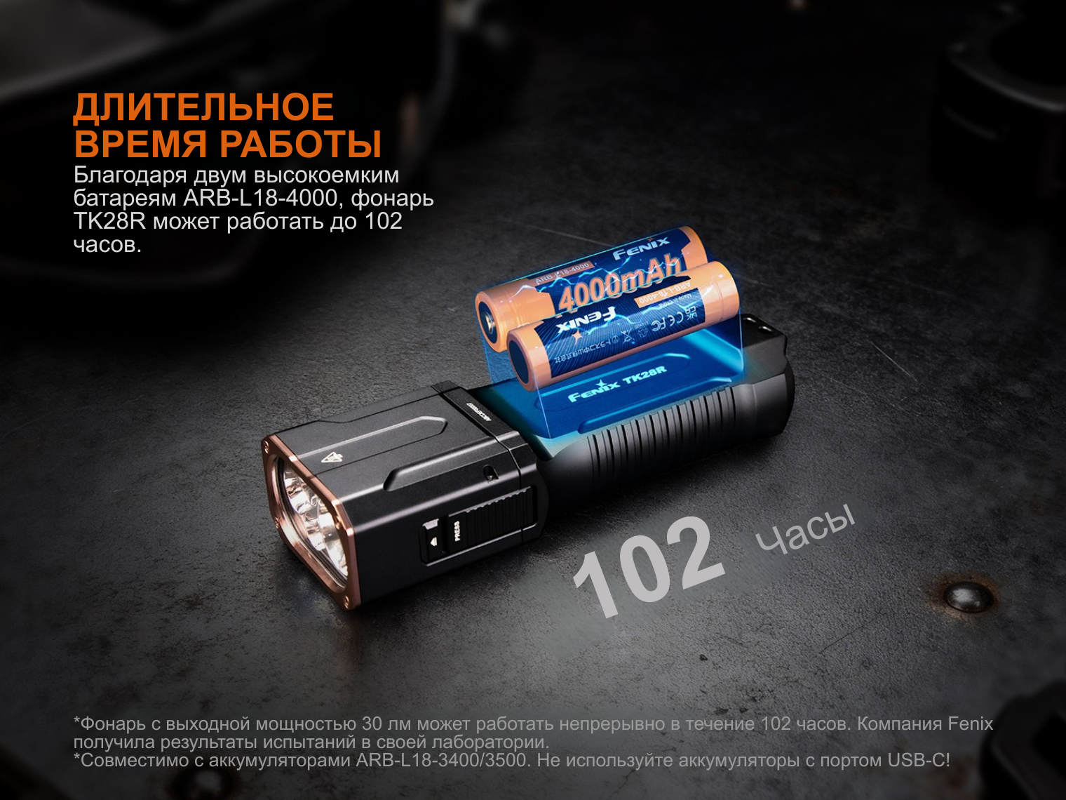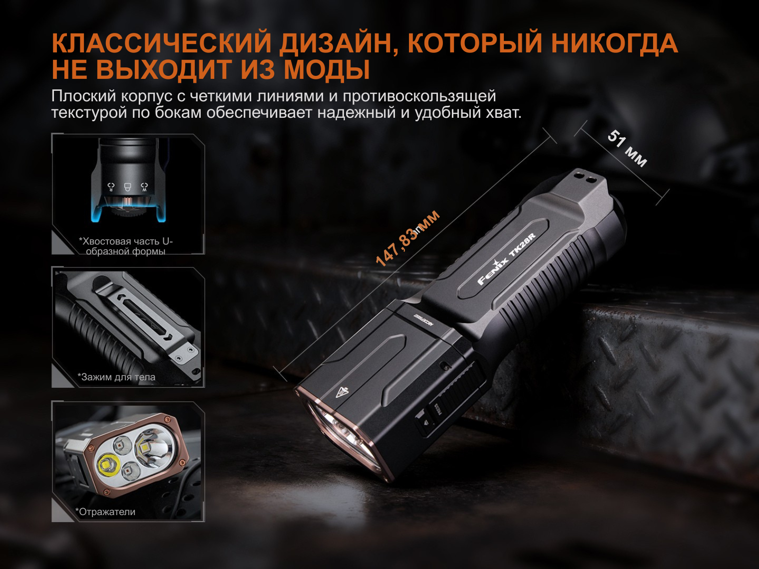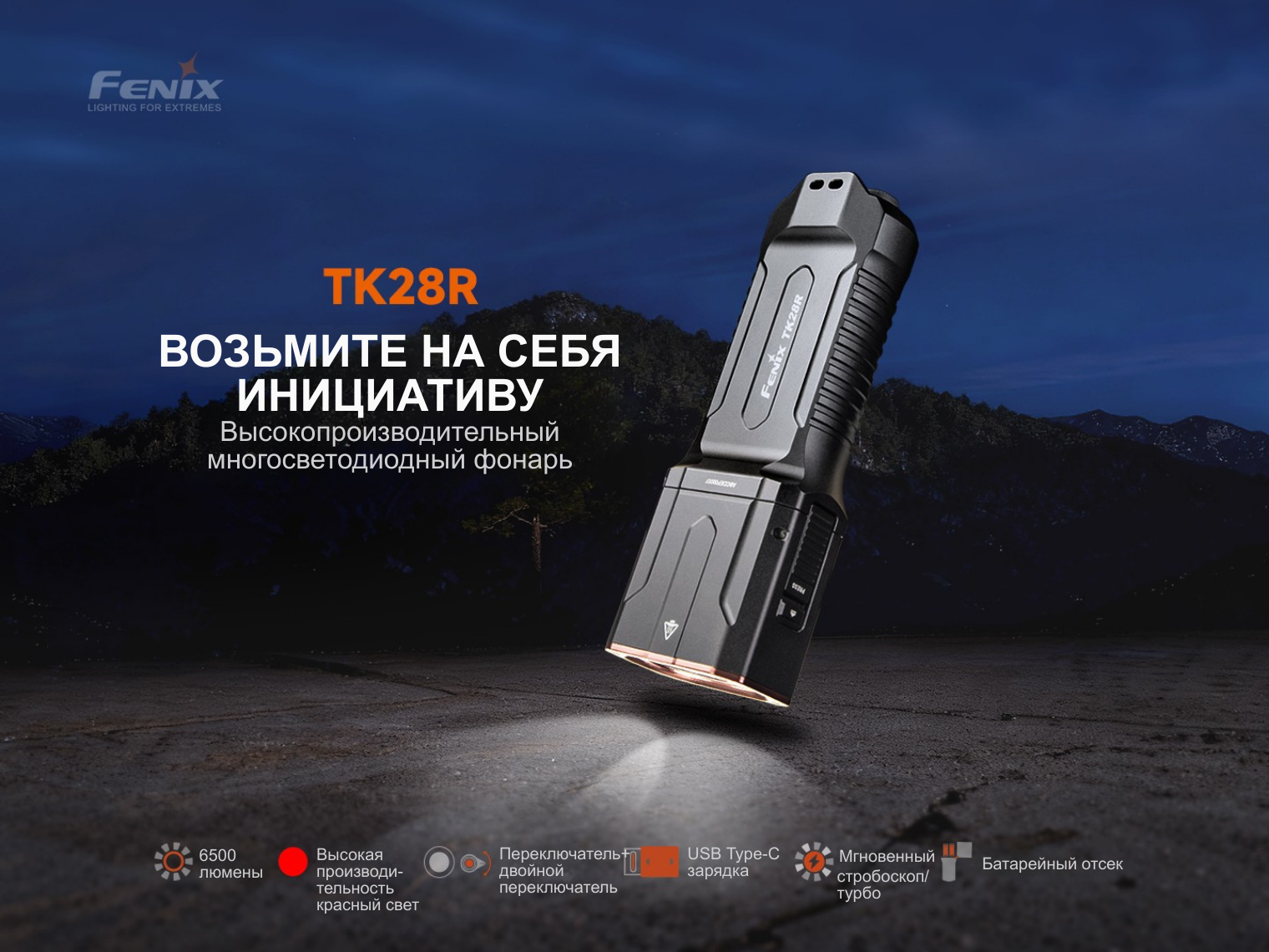 Ручной фонарь Fenix TK28R генерирует световой поток до 6500 люмен с дальностью луча до 400 м. Под линзой находятся белые и красные светодиоды. Питание от двух аккумуляторов 18650 с быстрой зарядкой через порт USB Type-C. Время автономной работы на одном заряде достигает 102 ч. Алюминиевый корпус с классом защиты IP68 дополнен клипсой.