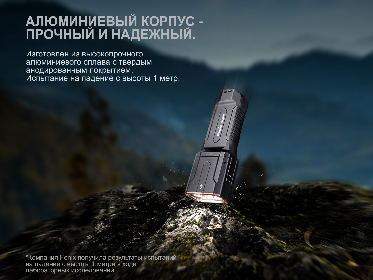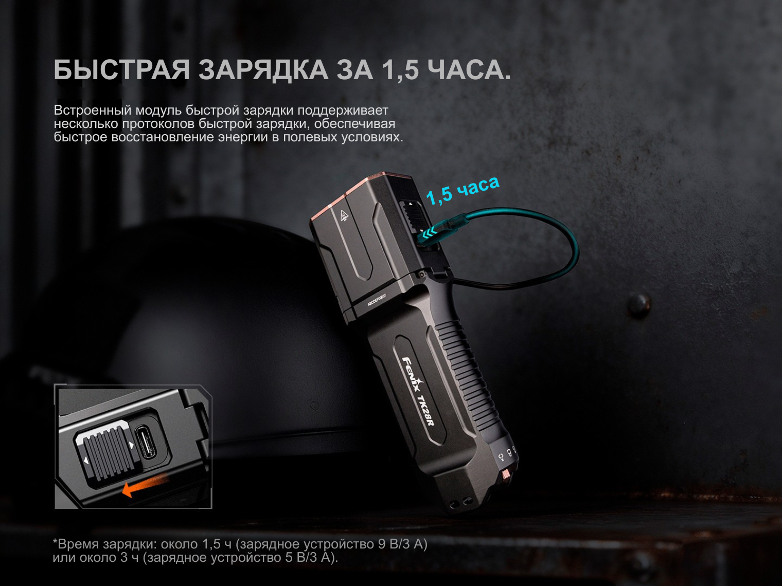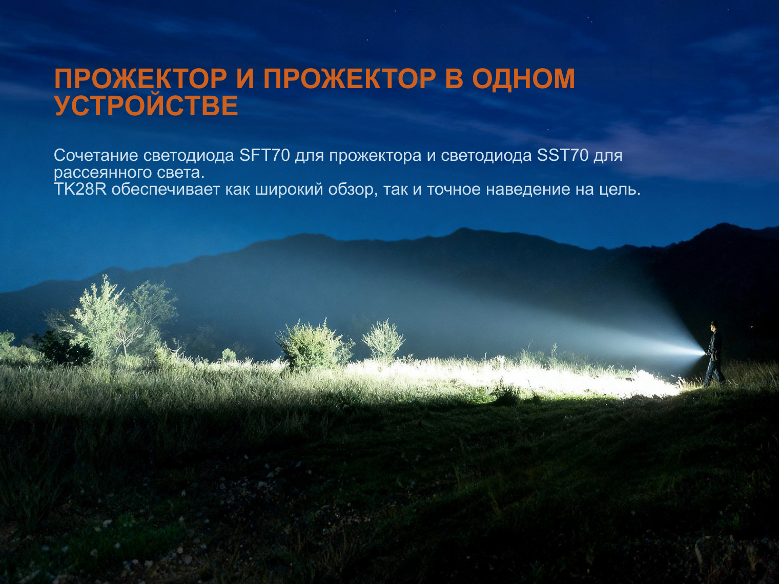 Ручной фонарь Fenix TK28R генерирует световой поток до 6500 люмен с дальностью луча до 400 м. Под линзой находятся белые и красные светодиоды. Питание от двух аккумуляторов 18650 с быстрой зарядкой через порт USB Type-C. Время автономной работы на одном заряде достигает 102 ч. Алюминиевый корпус с классом защиты IP68 дополнен клипсой.