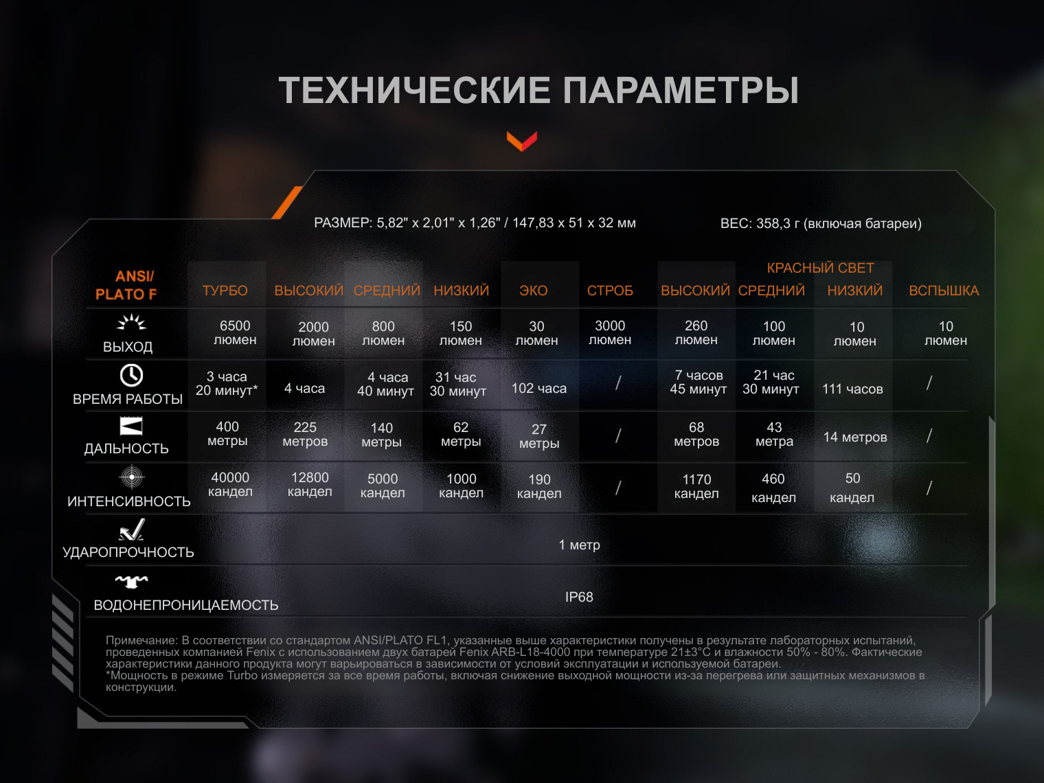 - Турбо: 6500 лм – 40000 кд – 3 ч 20 мин – 400 м;