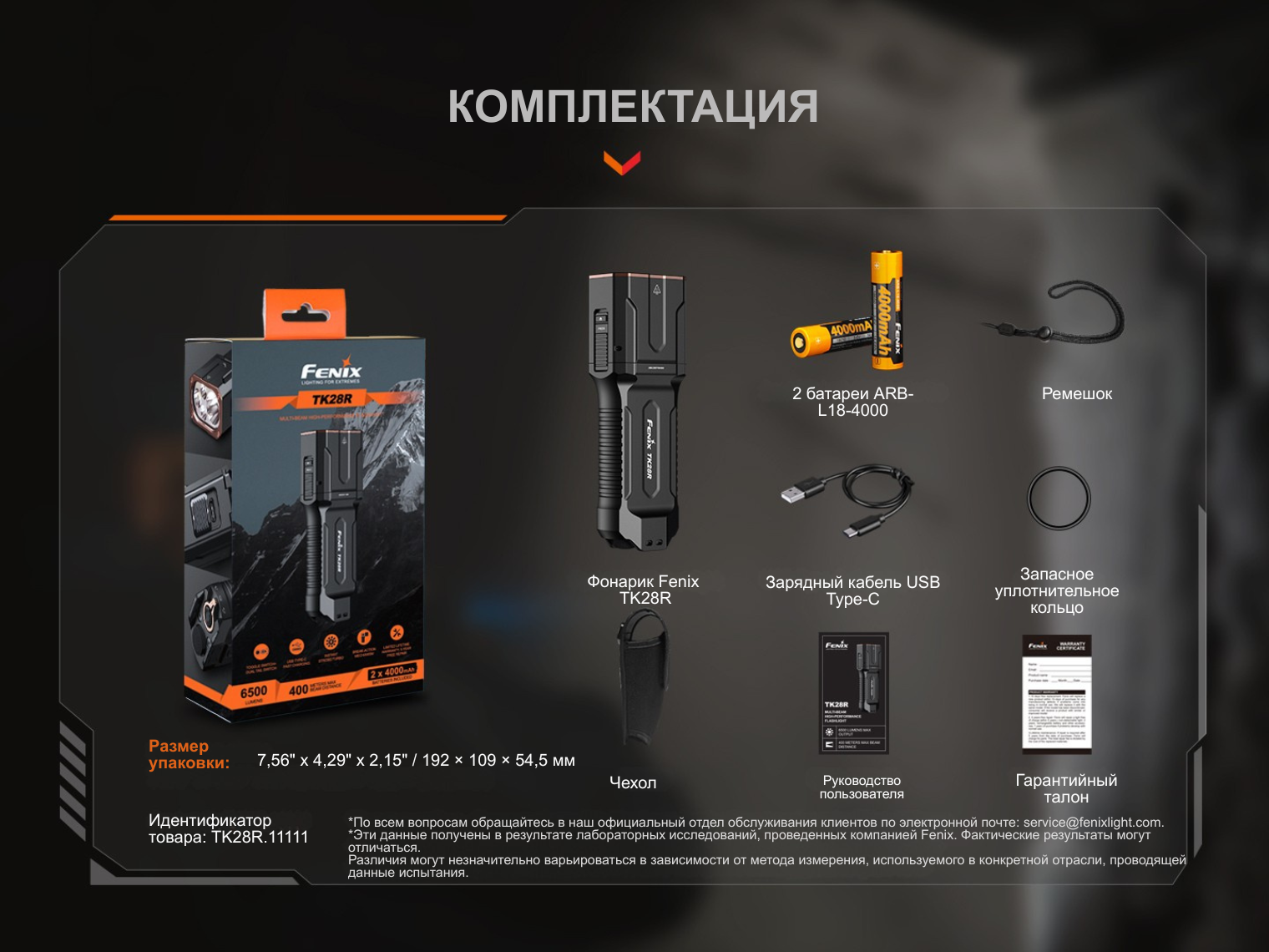 Комплектация | Фонарь Fenix TK28R, аккумуляторы Fenix ARB-L18-4000 (2 шт.), зарядный кабель USB-C, запасное уплотнительное кольцо, чехол, темляк, инструкция |