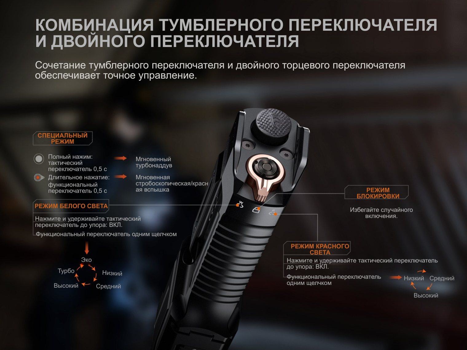 Система управления состоит из поворотного переключателя для выбора типа света и блокировки фонаря. Также есть электронная кнопка в хвосте для мгновенного доступа к основным режимам.