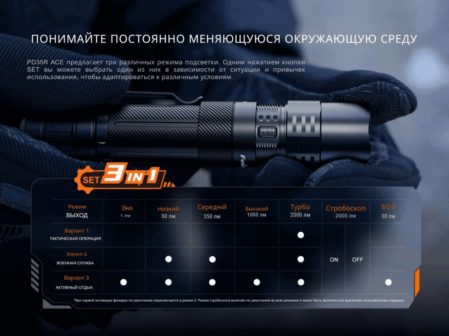 Тактический фонарь Fenix PD35R ACE с инновационной системой настройки режимов. Яркость света достигает 2000 лм при дальности 380 м. Доступны 7 вариантов освещения с управлением 3 переключателями, включая хвостовую кнопку. Источник питания — Li-ion аккумулятор 18650, который обеспечивает непрерывную работу фонаря до 90 суток без подзарядки. Алюминиевый корпус с накаткой дополнен съемной клипсой.