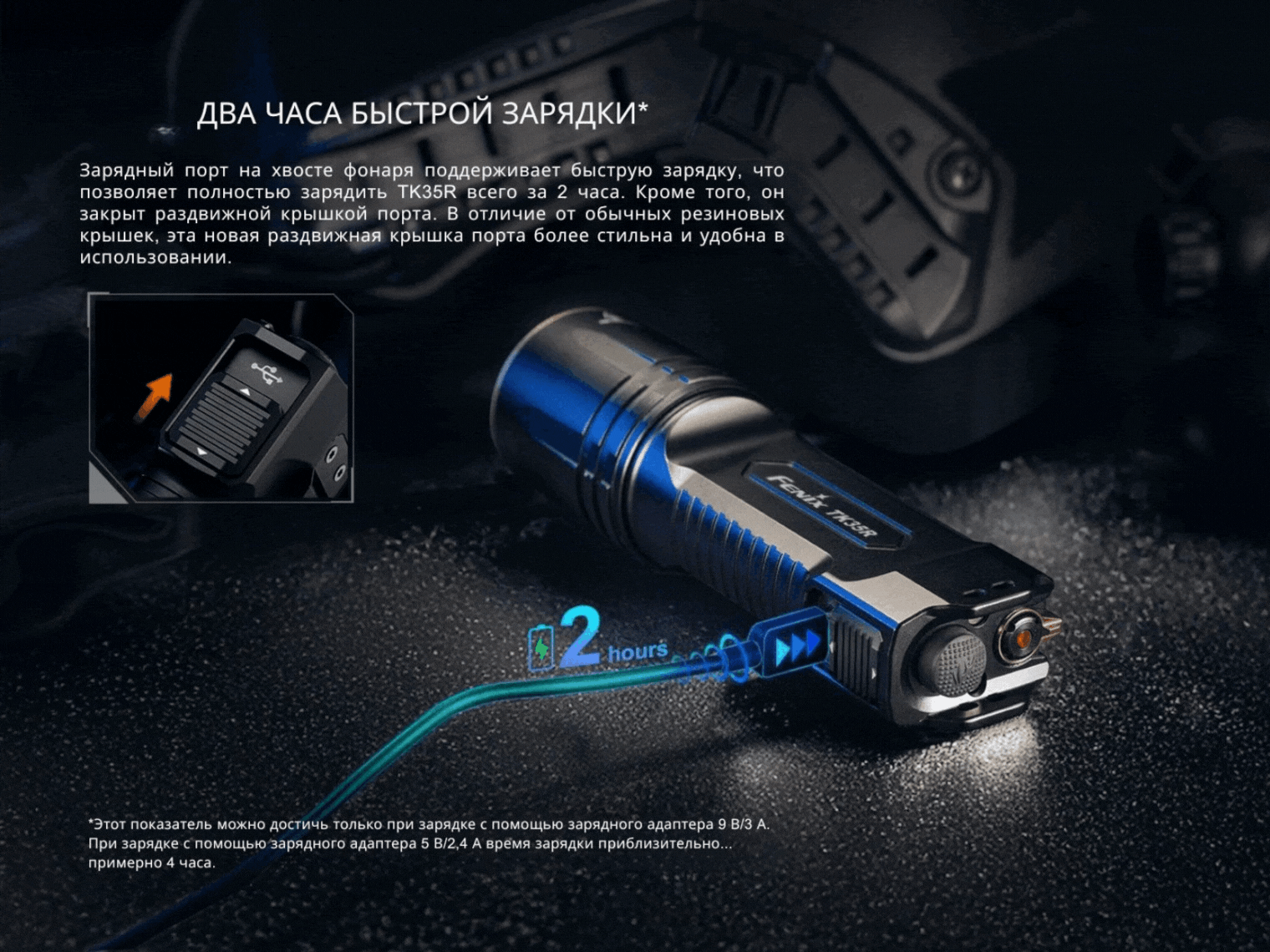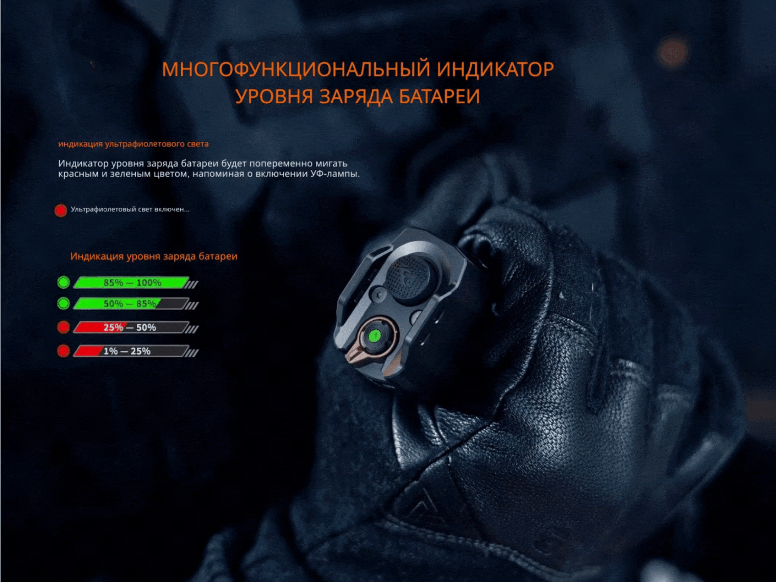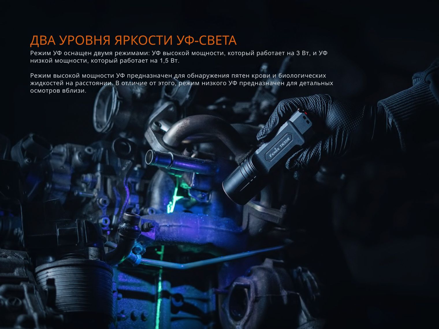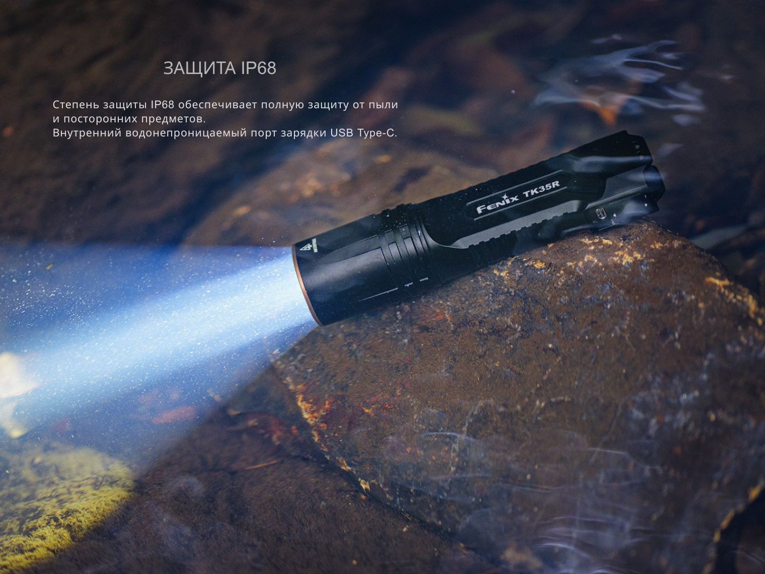 Фонарь Fenix TK35R генерирует белый свет (5800 лм) и УФ-излучение, предназначенное для выявления следов крови и утечек химических жидкостей. Доступны 8 режимов, которые управляются с помощью 2 хвостовых кнопок и переключателя FlexiSensa. Для питания используются аккумуляторы 18650 из комплекта. Есть функция быстрой зарядки через порт USB-C. Алюминиевый корпус имеет герметичные стыки по стандарту IP68.