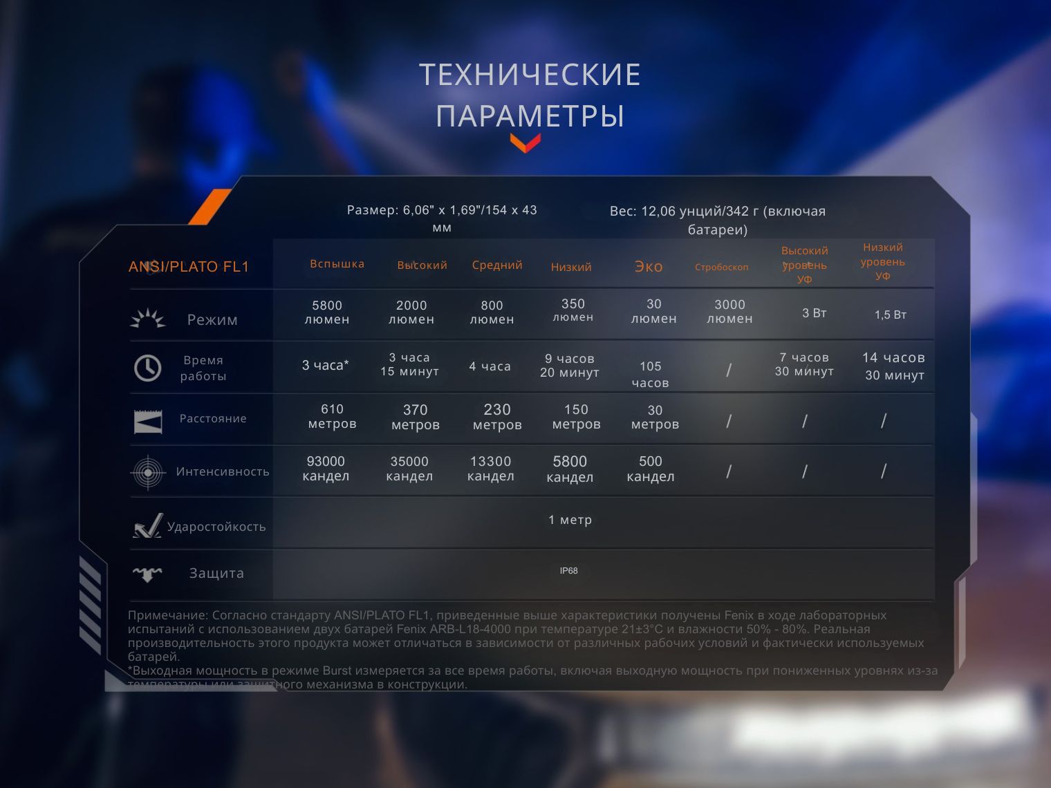Обратите внимание! Время работы в режиме Вспышка указано как сумма продолжительности работы на режимах с меньшей яркостью. На них система переключается автоматически, когда фонарь нагревается до критического уровня и срабатывает защита от перегрева.
