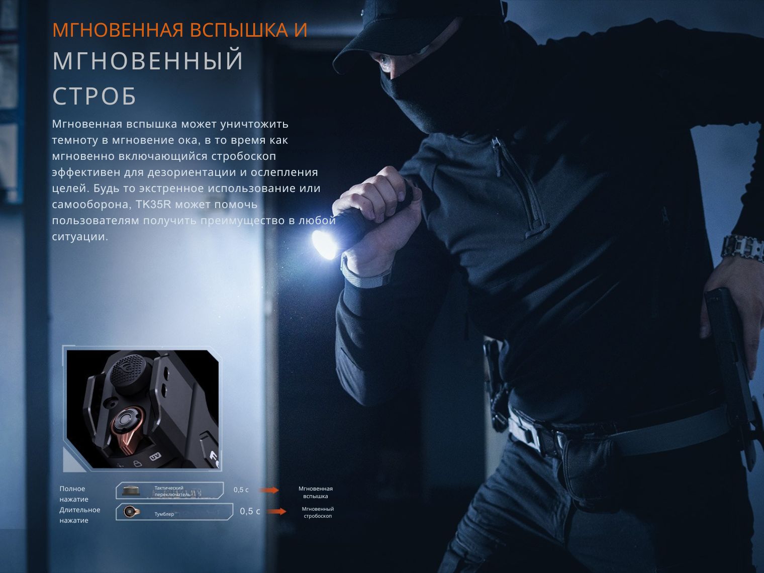 Фонарь Fenix TK35R — сверхяркий представитель тактических моделей, предназначенных для использования полицейскими, военными, спасателями и представителями спецслужб.