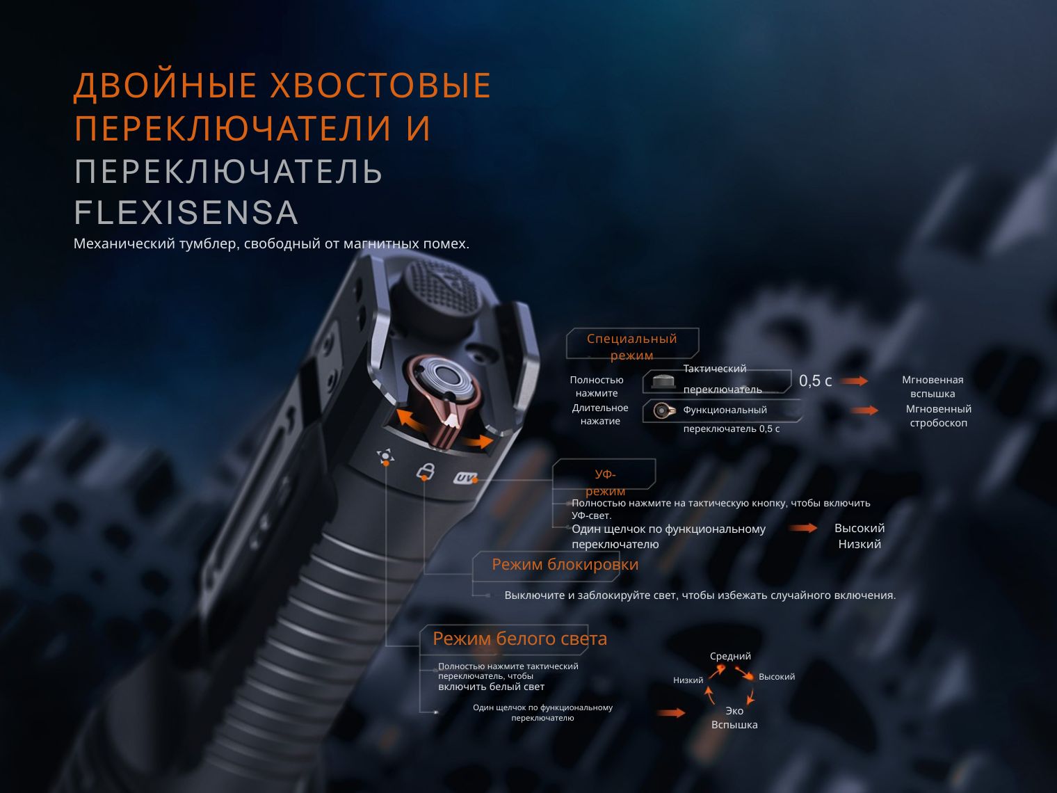 Управление представлено 2 хвостовыми кнопками и переключателем FlexiSensa для быстрой настройки света. Мгновенный доступ к режимам Вспышка и Стробоскоп позволяет быстро реагировать на ситуацию в критический момент.