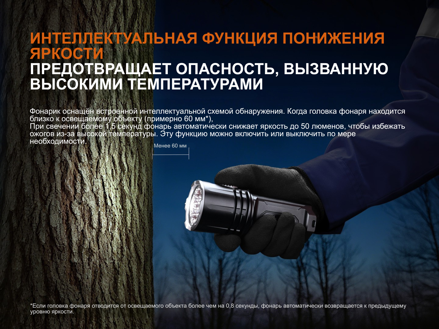 Фонарь дополнен интеллектуальным датчиком приближения. Он отвечает за автоматическое снижение яркости до 50 люмен, если голова работающего устройства приближается к освещаемой поверхности ближе чем на 60 мм. Эта функция предотвращает случайное возгорание предметов, на которые воздействует сверхмощный луч.