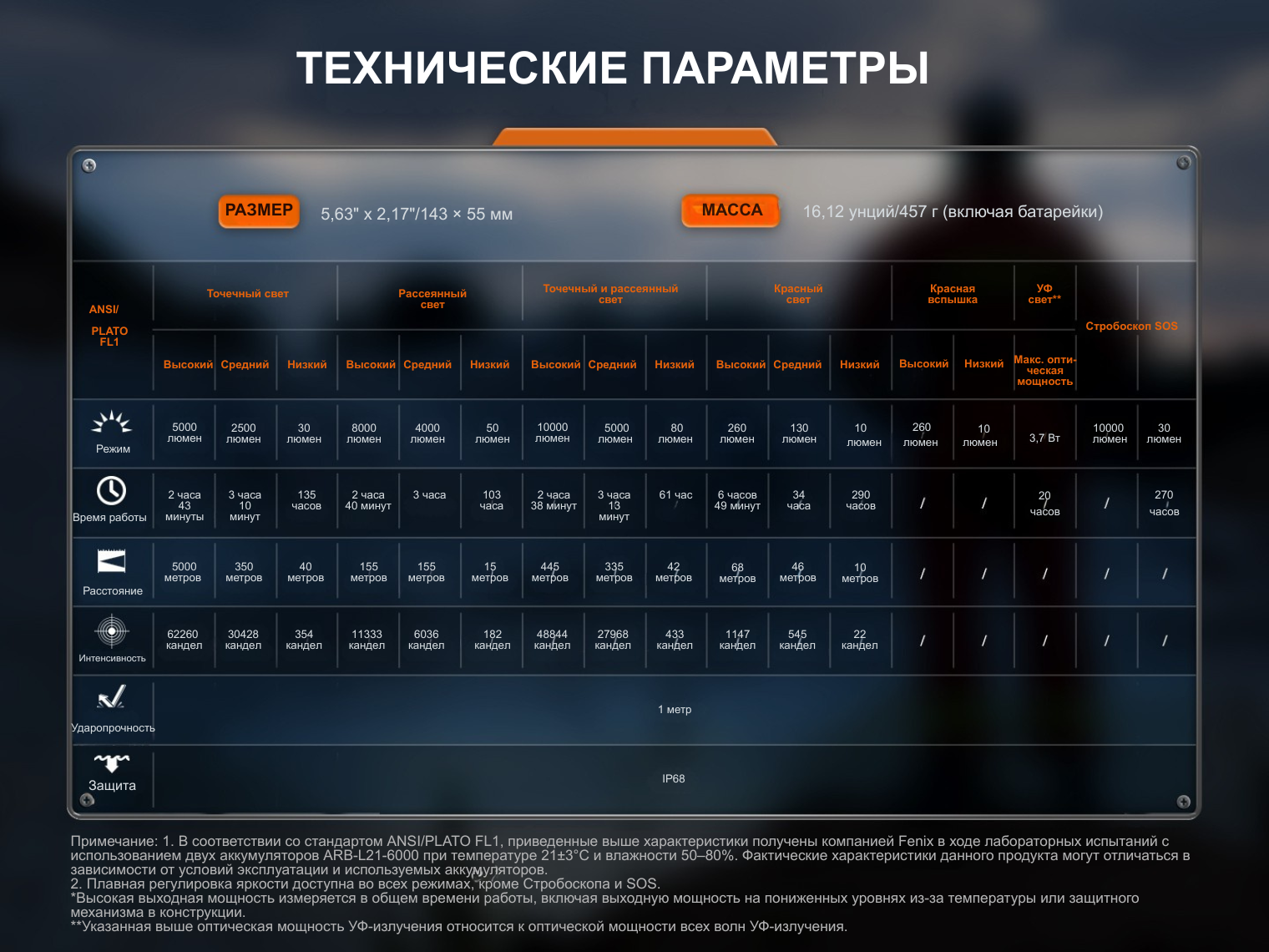 - Белые светодиоды 4 х Luminus SFT25 + 8 x Luminus SST25. Яркость луча достигает рекордных 10000 люмен, а дальность — до 445 м, что позволяет осветить огромное пространство, идентифицировать мелкие предметы и выявить преграды на пути.