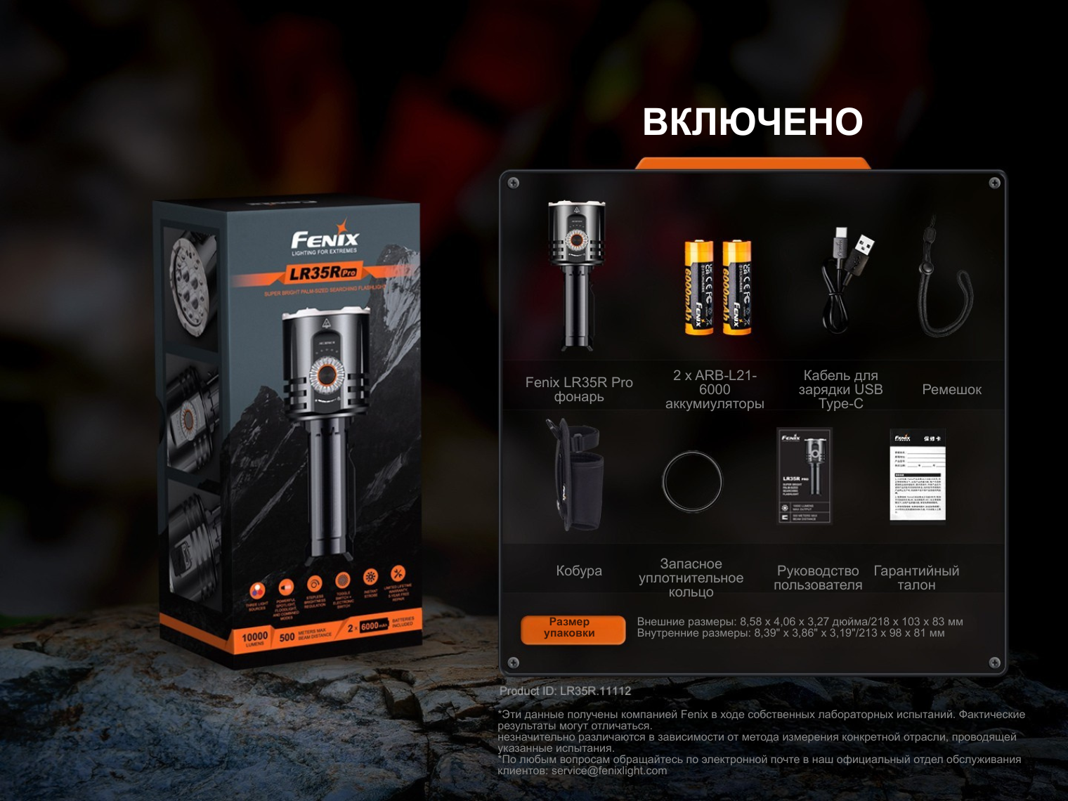 Комплектация | Fenix LR35R PRO с клипсой, 2 х аккумуляторы 21700, зарядный кабель USB-C, запасное уплотнительное кольцо, темляк, чехол, инструкция |