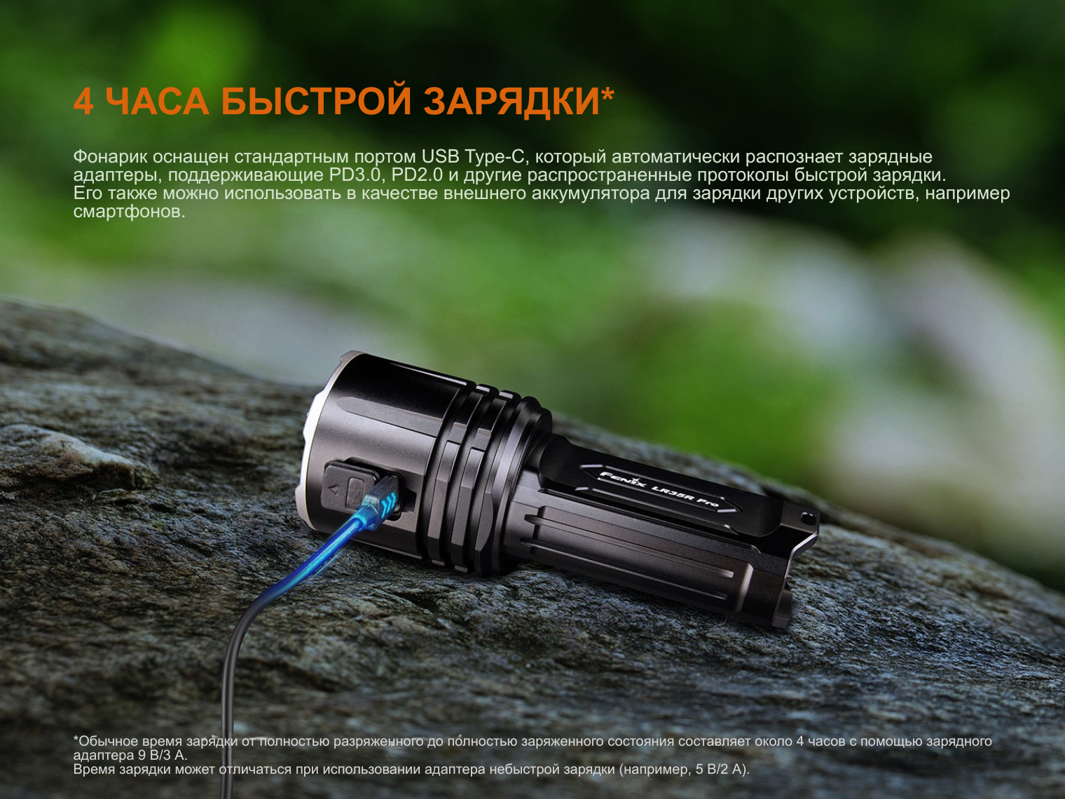Зарядный порт USB-C поддерживает протоколы быстрой зарядки PD2.0, PD3.0 и другие. Среднее время зарядки — 4 ч. Порт является двунаправленным и подходит для зарядки сторонней техники, позволяя использовать фонарь как переносной Power Bank.