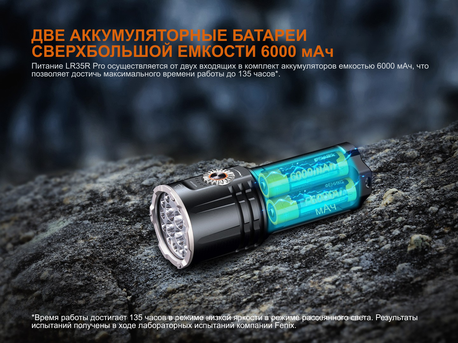 Fenix LR35R PRO питается от блока из 2 аккумуляторов по 6000 мАч из комплекта. Это Li-ion батареи, невосприимчивые к «эффекту памяти» и выдерживающие более 500 циклов зарядки/разрядки с сохранением 75% первоначальной емкости.