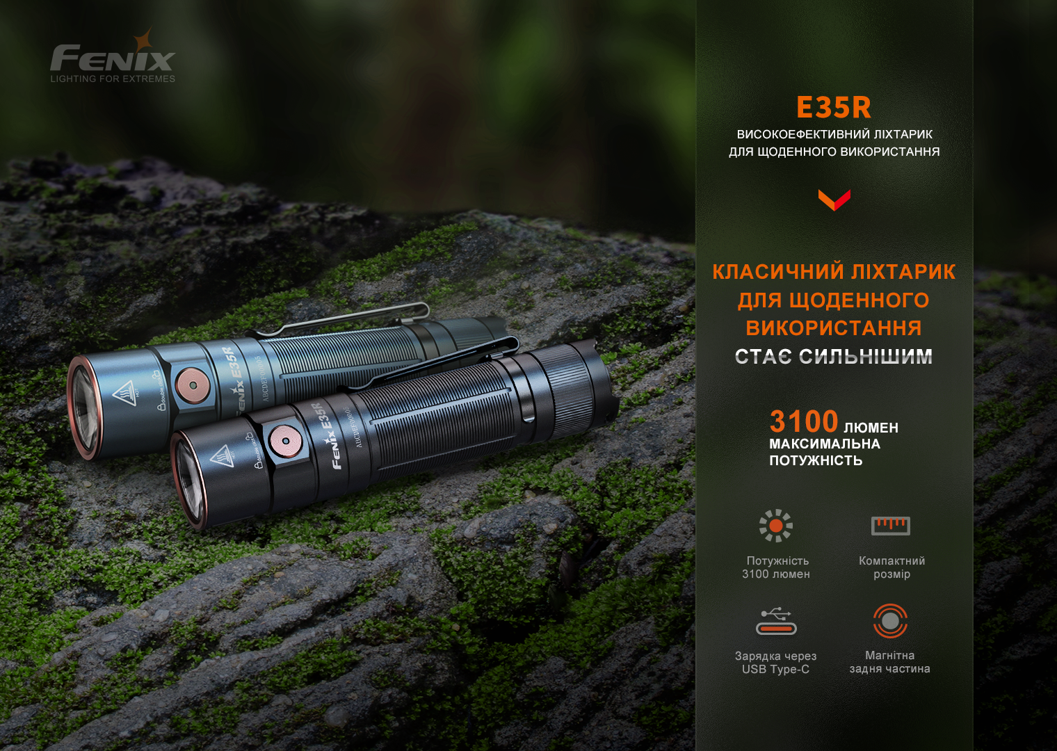 Ручний EDC-ліхтар Fenix E35R з максимальною яскравістю 3100 лм та дальністю променя до 260 м. Робота від акумулятора 21700 (5000 мА·год). Заряджається через порт USB-C приблизно за 3 год. Доступні 6 режимів з холодним білим світлом, які перемикаються однією кнопкою з вбудованим індикатором статусу заряду. Корпус із алюмінію A6061-T6 герметичний за стандартом IP68. Конструкція важить 148 г та доповнена вбудованим магнітом та знімною кліпсою.