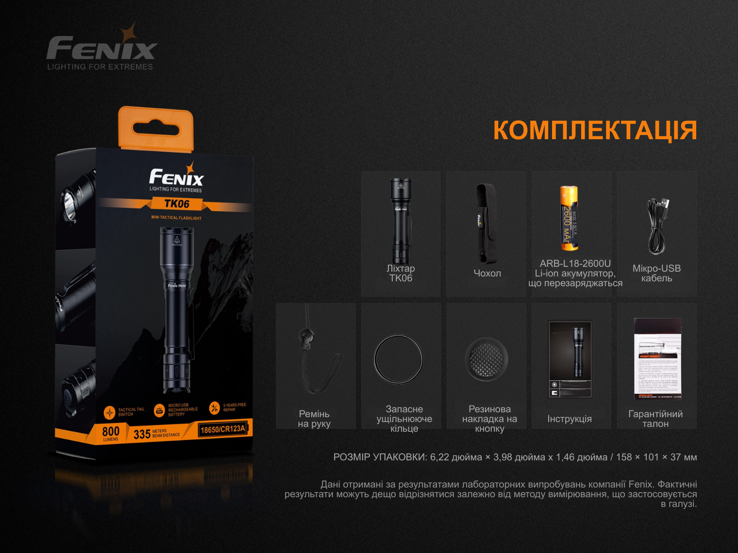 Модель ліхтаря Fenix TK06, акумулятор 18650 літій-іонний, кабель для зарядного пристрою micro-USB, ремінь на руку, чохол, запасне кільце ущільнювача, додаткова гумова накладка на кнопку, гарантійний талон, керівництво до застосування.
