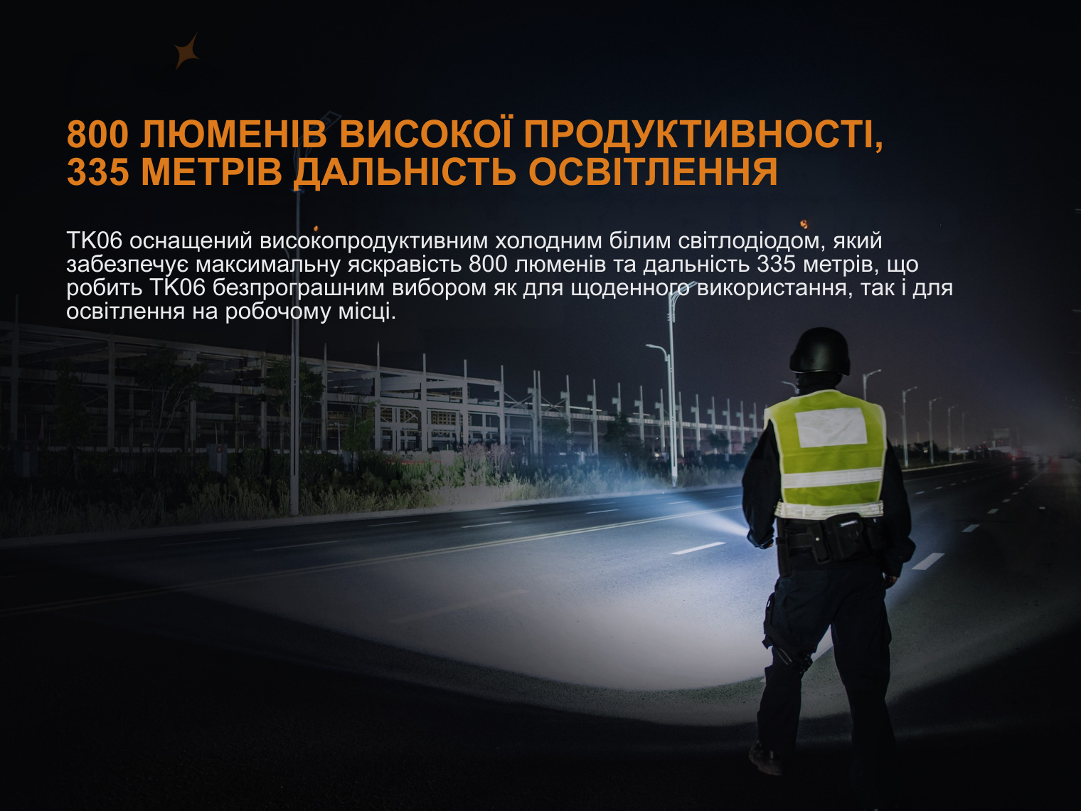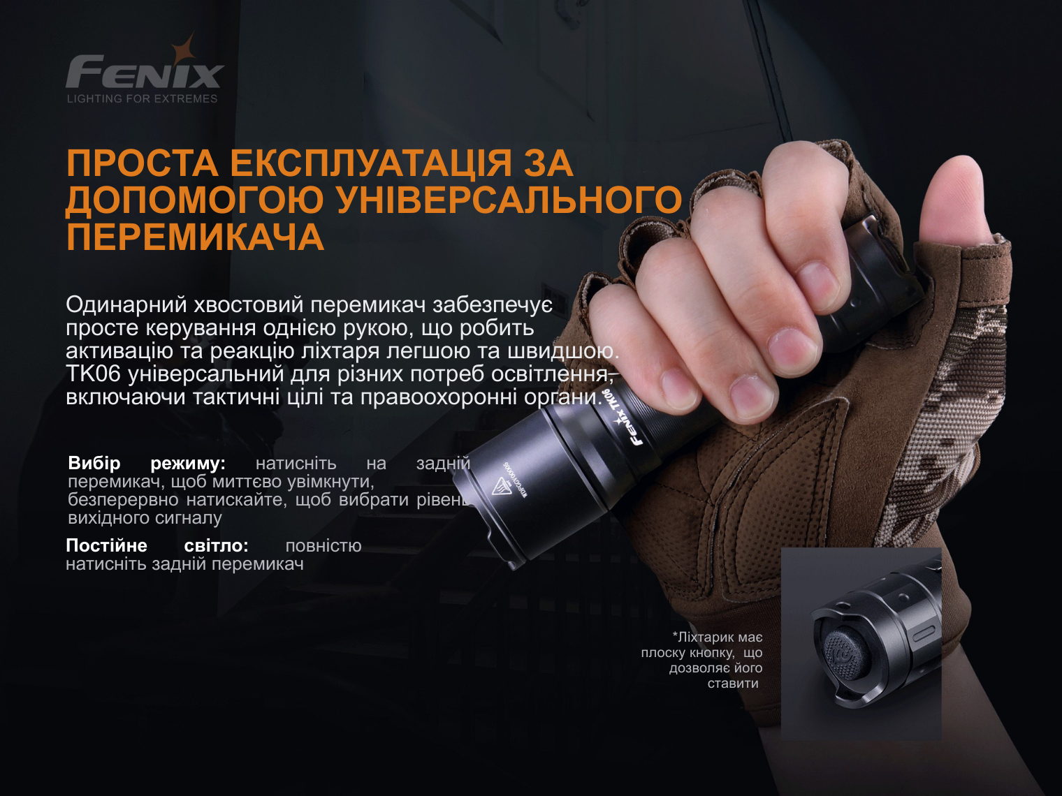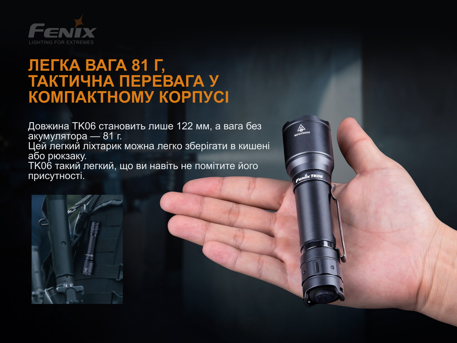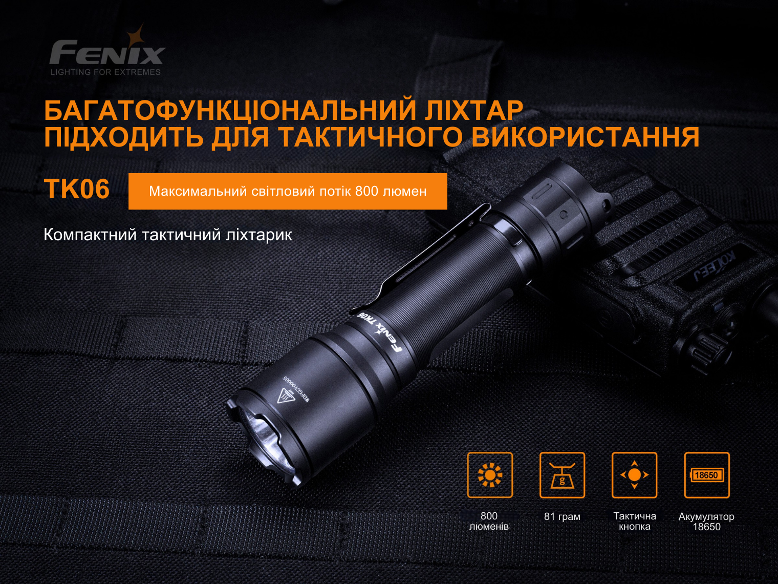 Ліхтар Fenix TK06 являє собою багатофункціональну модель. Годиться для щоденного використання, як з метою роботи, так і відпочинку. Функціонує прилад на діоді Luminus SST20 L4, з живленням від 18650 літій-іонної акумуляторної батареї. Це акумулятор ARB-L18-2600U. діод дає холодне біле освітлення, і може світити протягом 50 тисяч годин. Ліхтар видає максимальний світловий потік в 800 люменів, а максимальна відстань дії променя становить 335 метрів. Можете також використовувати дві літієві батарейки CR123A.