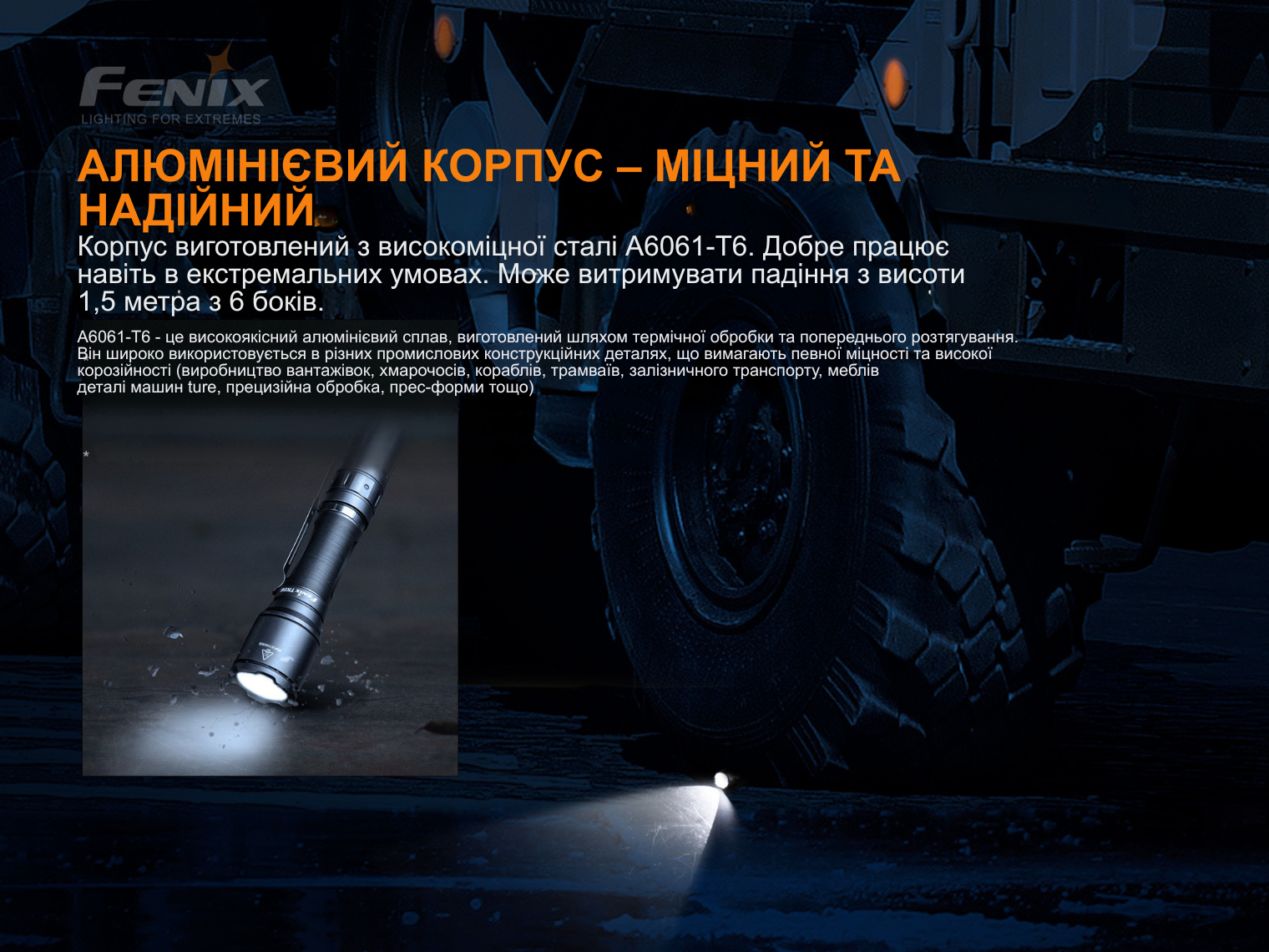 Корпус ліхтаря складається з міцного, зносостійкого матеріалу – алюмінію а6061-Т6. Даний матеріал застосовується дуже широко в багатьох сферах промисловості. Він надійний, і забезпечує моделі такі відмінні якості. Зокрема, прилад витримує падіння з висоти одного метра. Корпус має високоміцне анодування, завдяки чому він стійкий до абразивів.