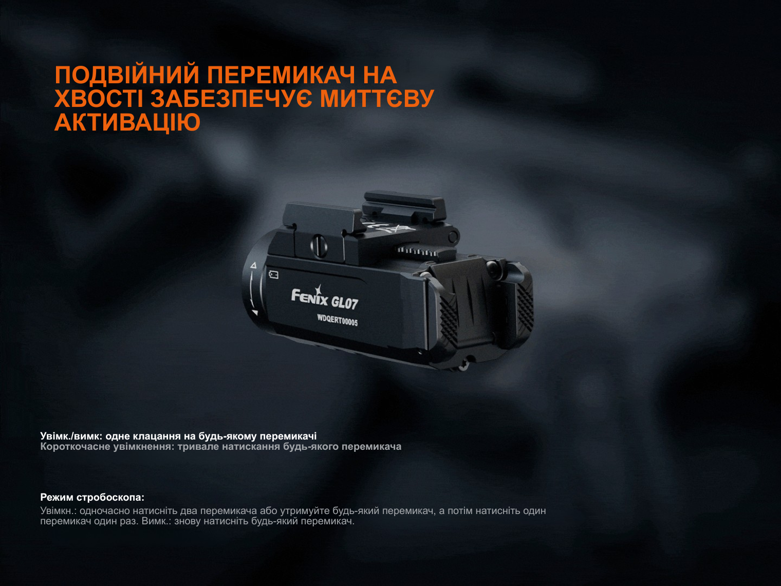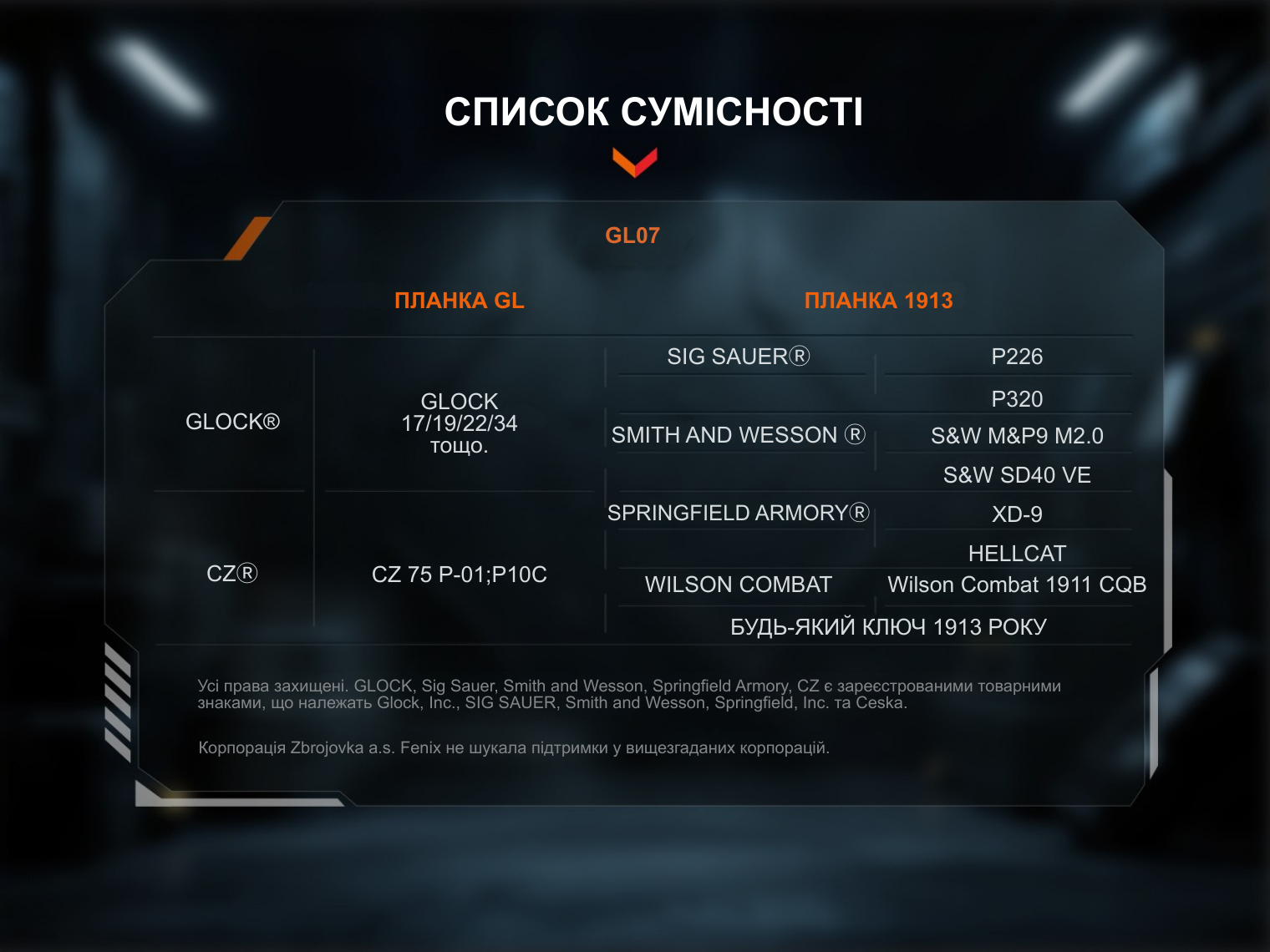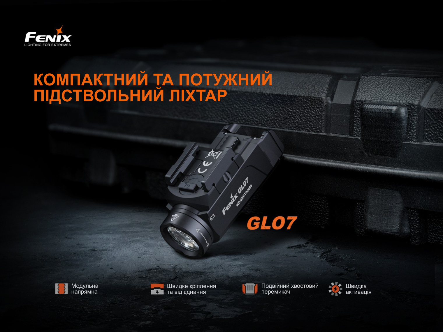 Ліхтар Fenix GL07 оснащений універсальним швидкознімним кріпленням, сумісним з планками Glock та Picatinny. Модульна база з рухомими напрямними дозволяє швидко адаптувати положення пристрою під різні моделі зброї — від повнорозмірних до компактних пістолетів, таких як Springfield Hellcat.