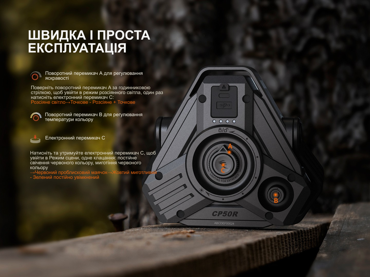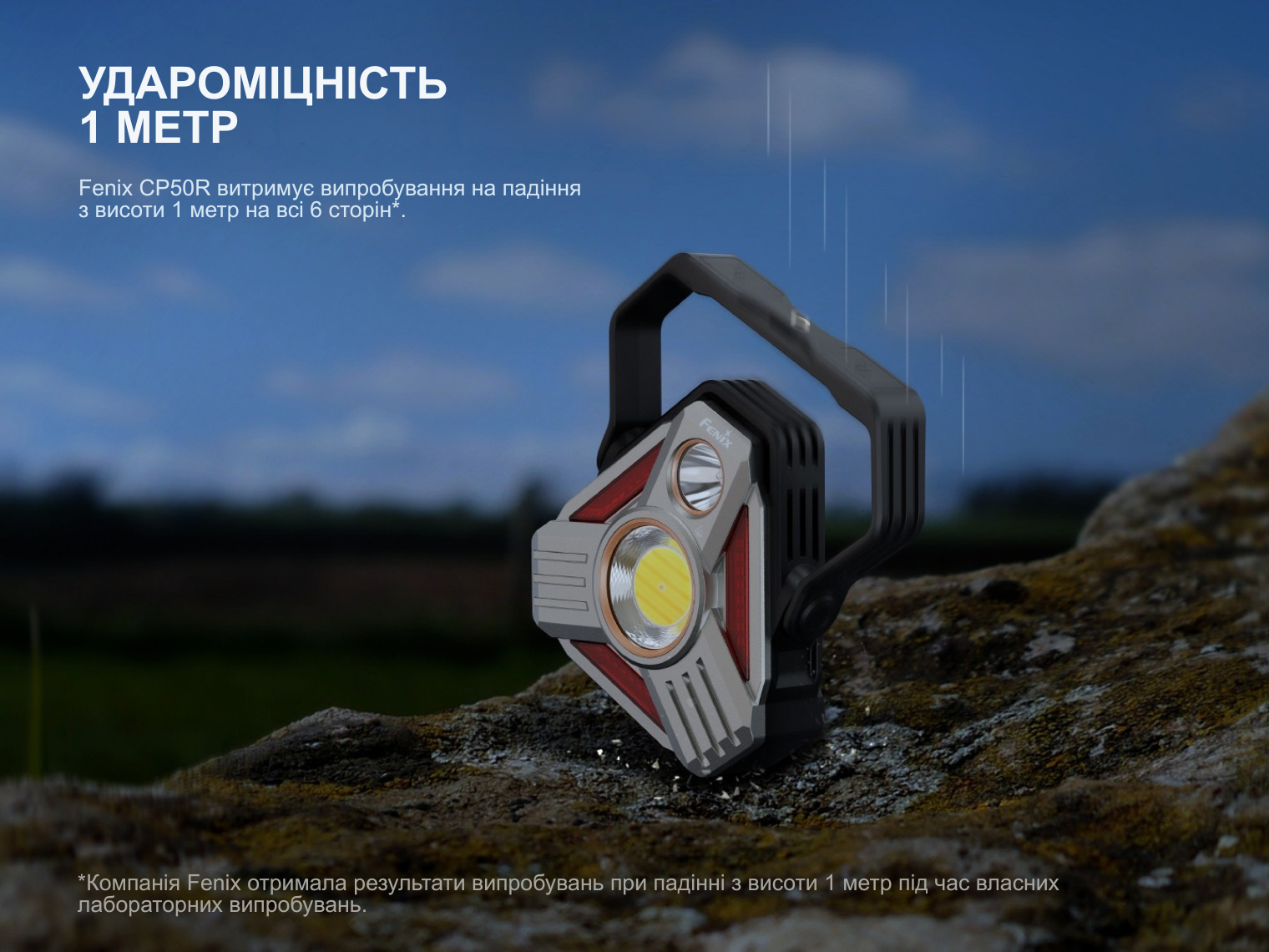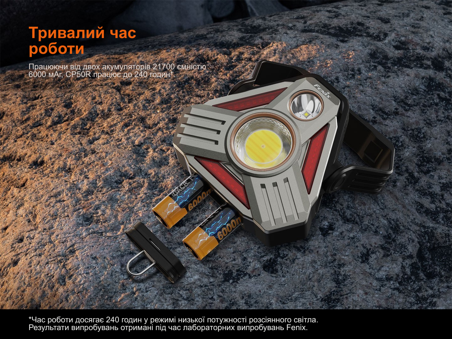 Ліхтар Fenix CP50R пропонує 4 групи режимів з можливістю генерування далекобійного, прожекторного, комбінованого та сигнального світла. Максимальна яскравість сягає 5500 лм. Є можливість плавного регулювання колірної температури від 2700 до 6500K. Живлення від двох акумуляторів 21700. Можна використовувати як Power Bank (порти USB-C та USB-A). Алюмінієвий корпус має обертову магнітну рукоять і різьбове з'єднання.