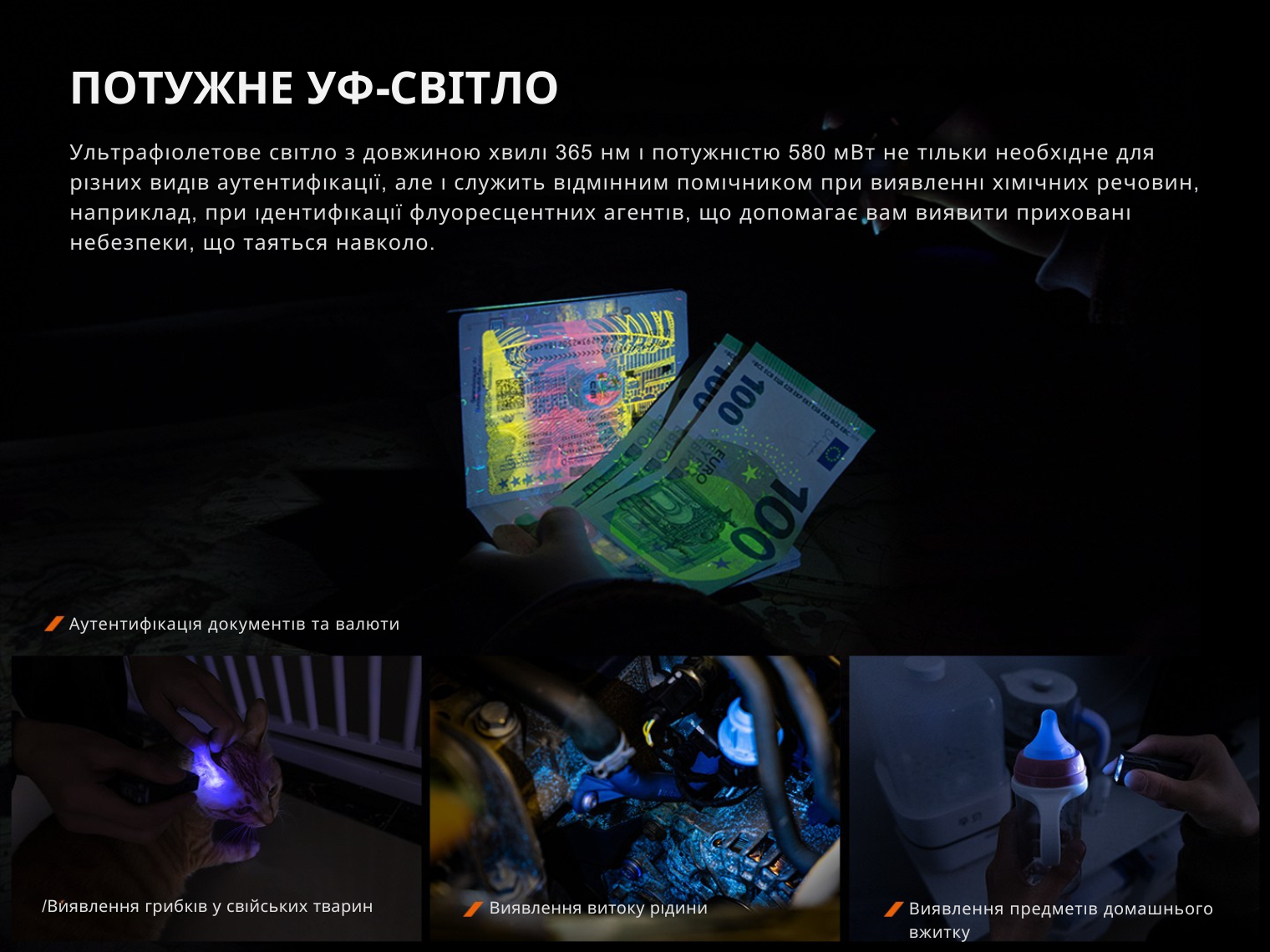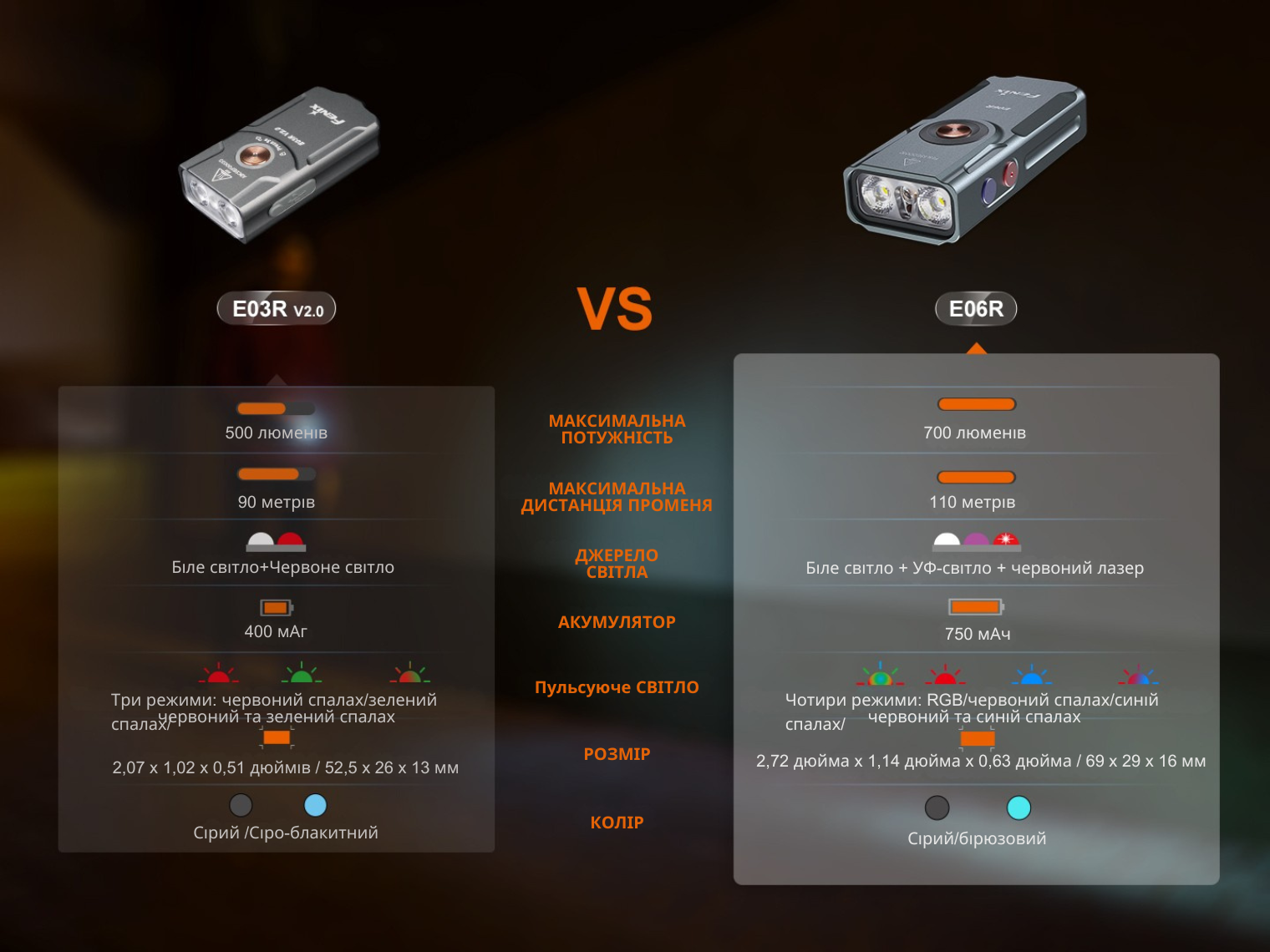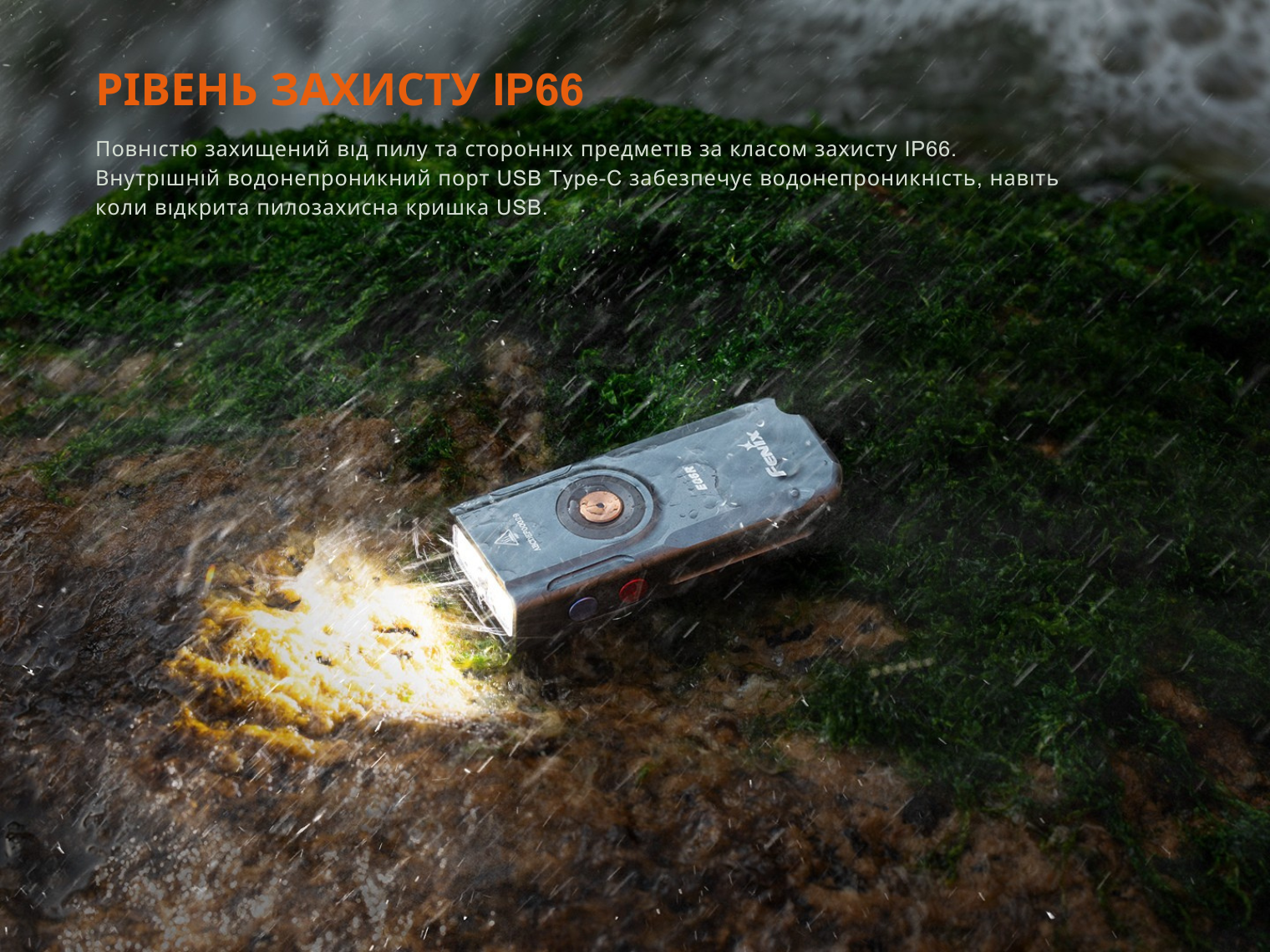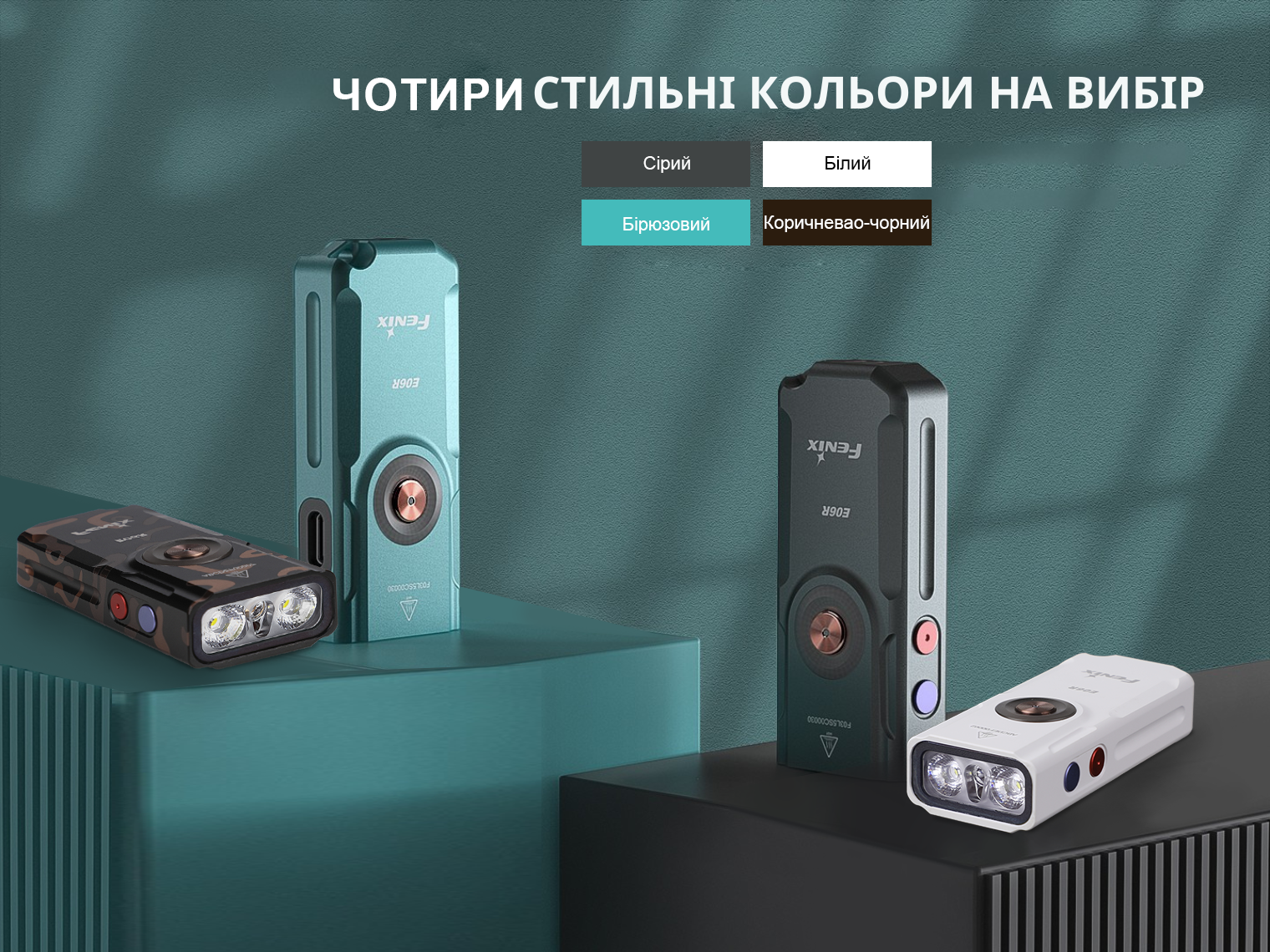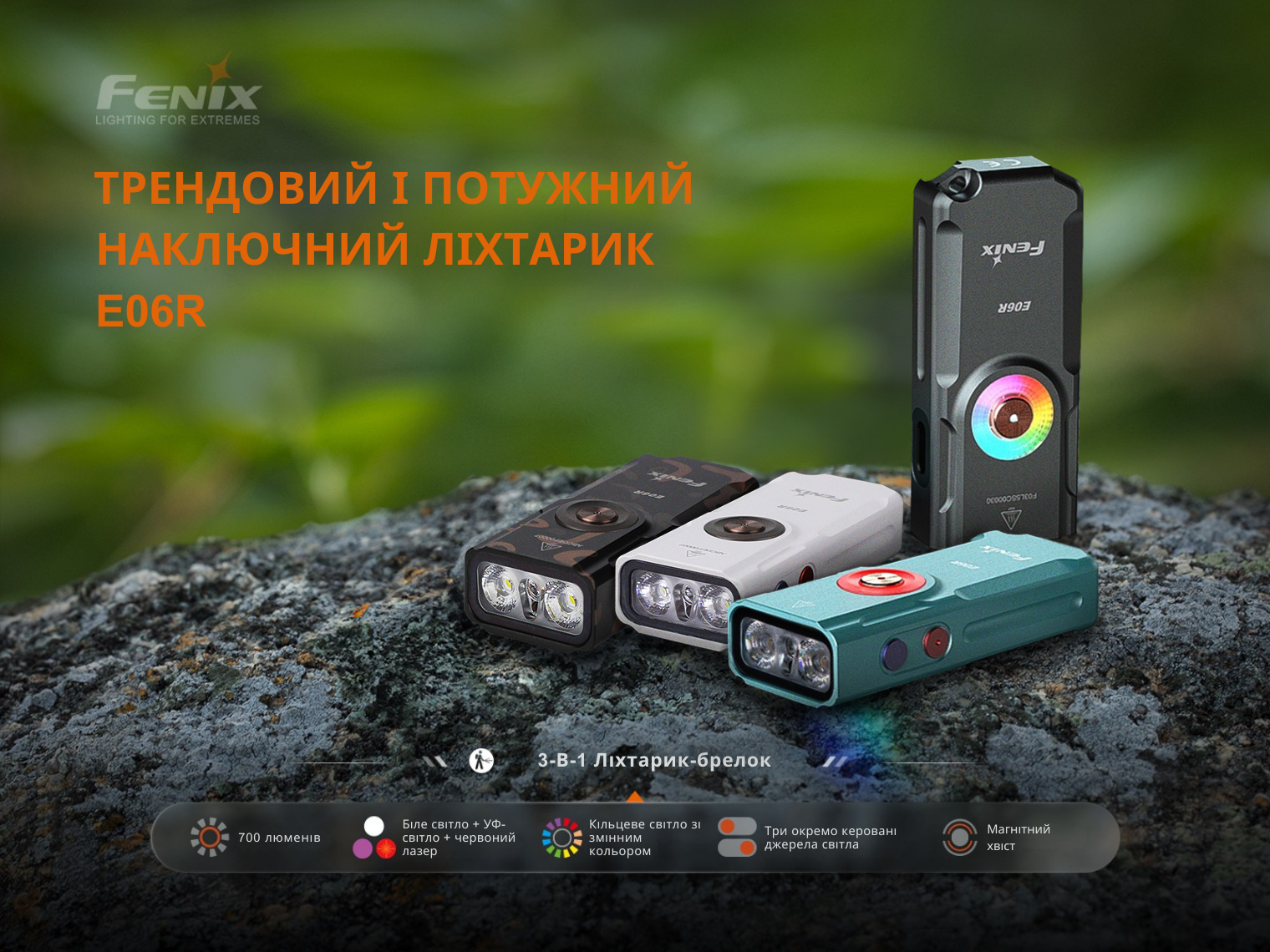 Багатофункціональний ліхтар Fenix E06R має 10 режимів. Керування розподілено на окремі перемикачі для білого променя, УФ-світла та лазера 1-го класу ≤0,39 мВт. Кільцеве RGB-підсвічування навколо основної кнопки працює як декоративне та сигнальне. Вбудований акумулятор 750 мА·год заряджається через порт USB-C приблизно впродовж 2 год. Корпус з анодованого металу із захистом IP66. Є кліпса, кільце для ключів та магніт у хвості.