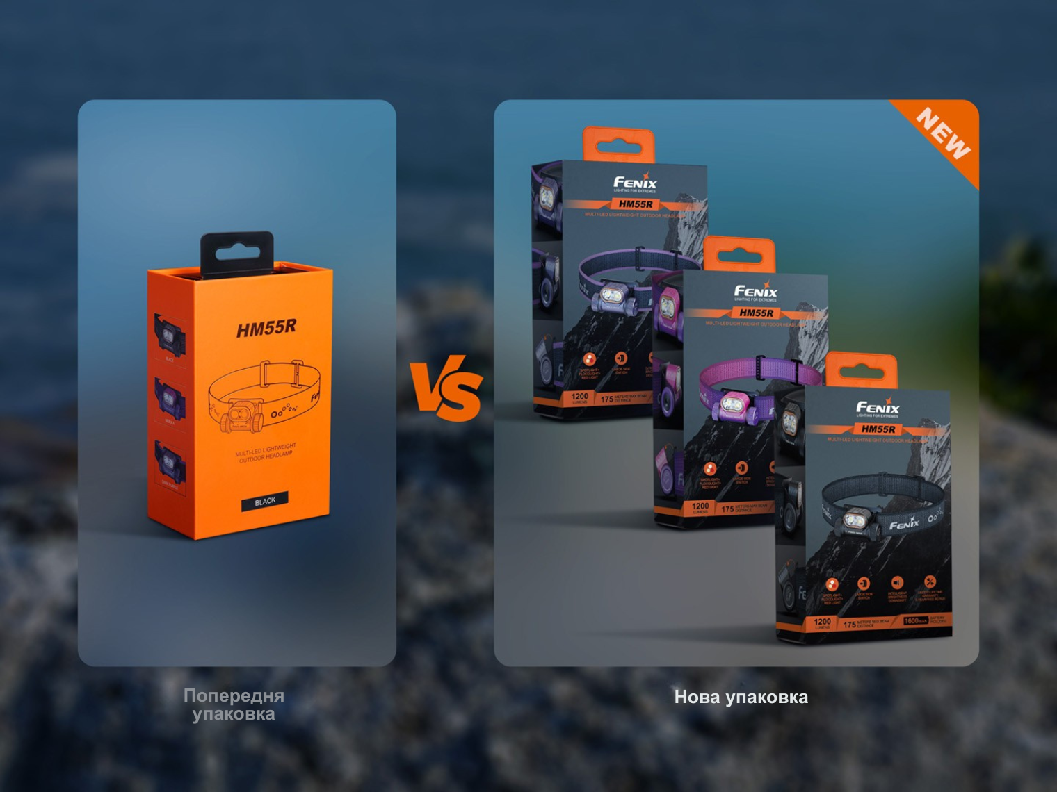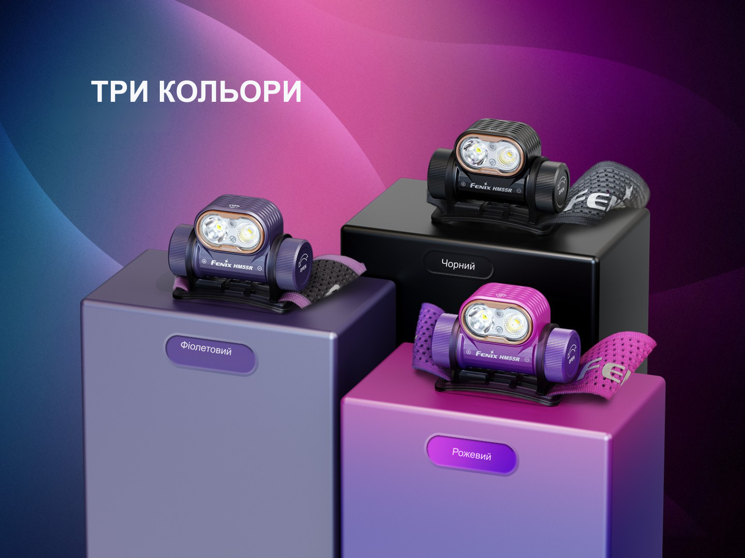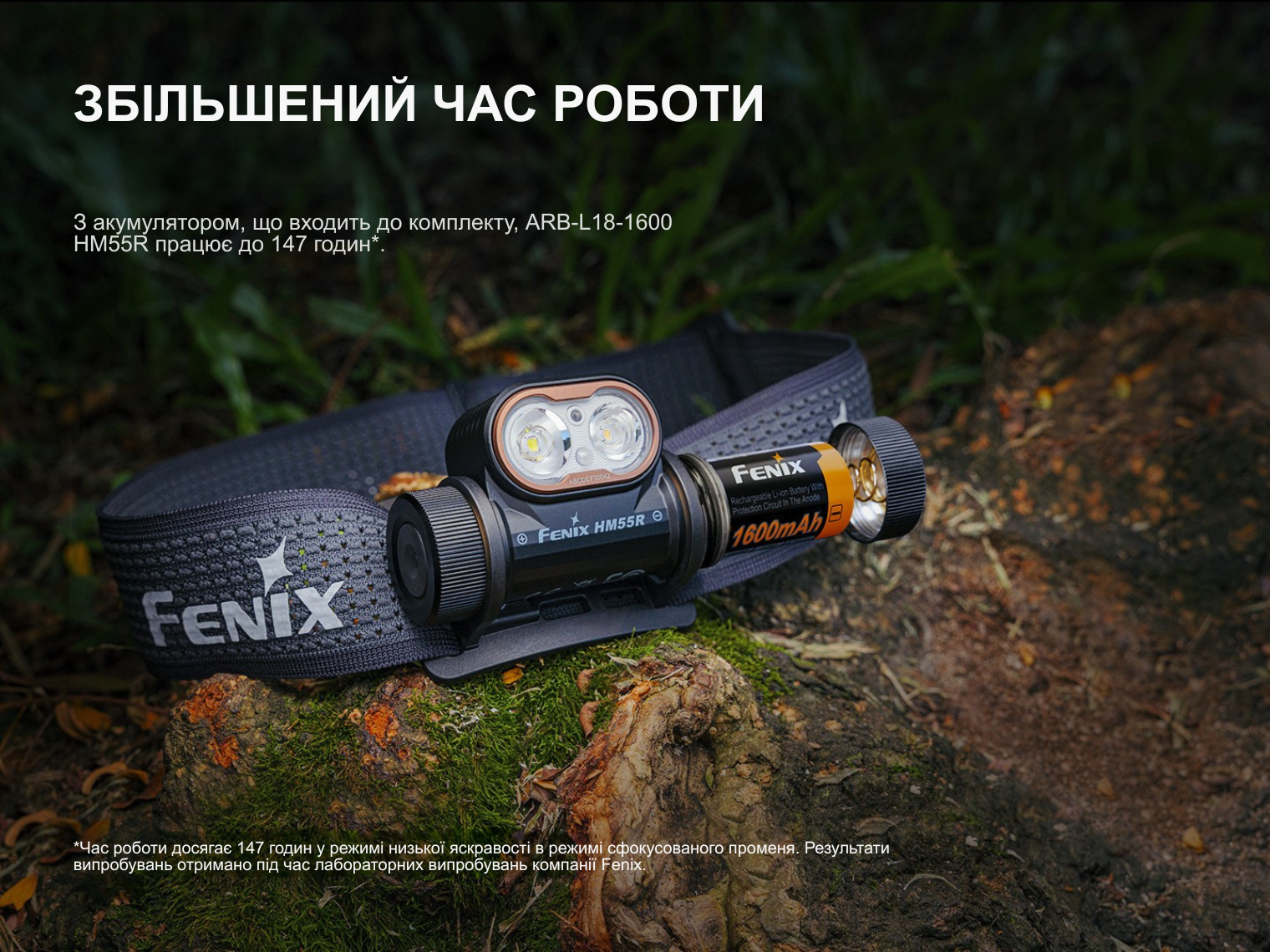 Налобний ліхтар Fenix HM55R укомплектований випромінювачами з колірною температурою 6500К та 5000К, а також червоним діодом. Максимальна яскравість променя сягає 1200 лм за дальності 175 м. Інтелектуальний датчик наближення автоматично знижує потужність у разі надто близького розміщення до освітлюваного об'єкта. Акумулятор 18350 заряджається через порт USB-C та забезпечує до 141 год роботи на одному заряді.