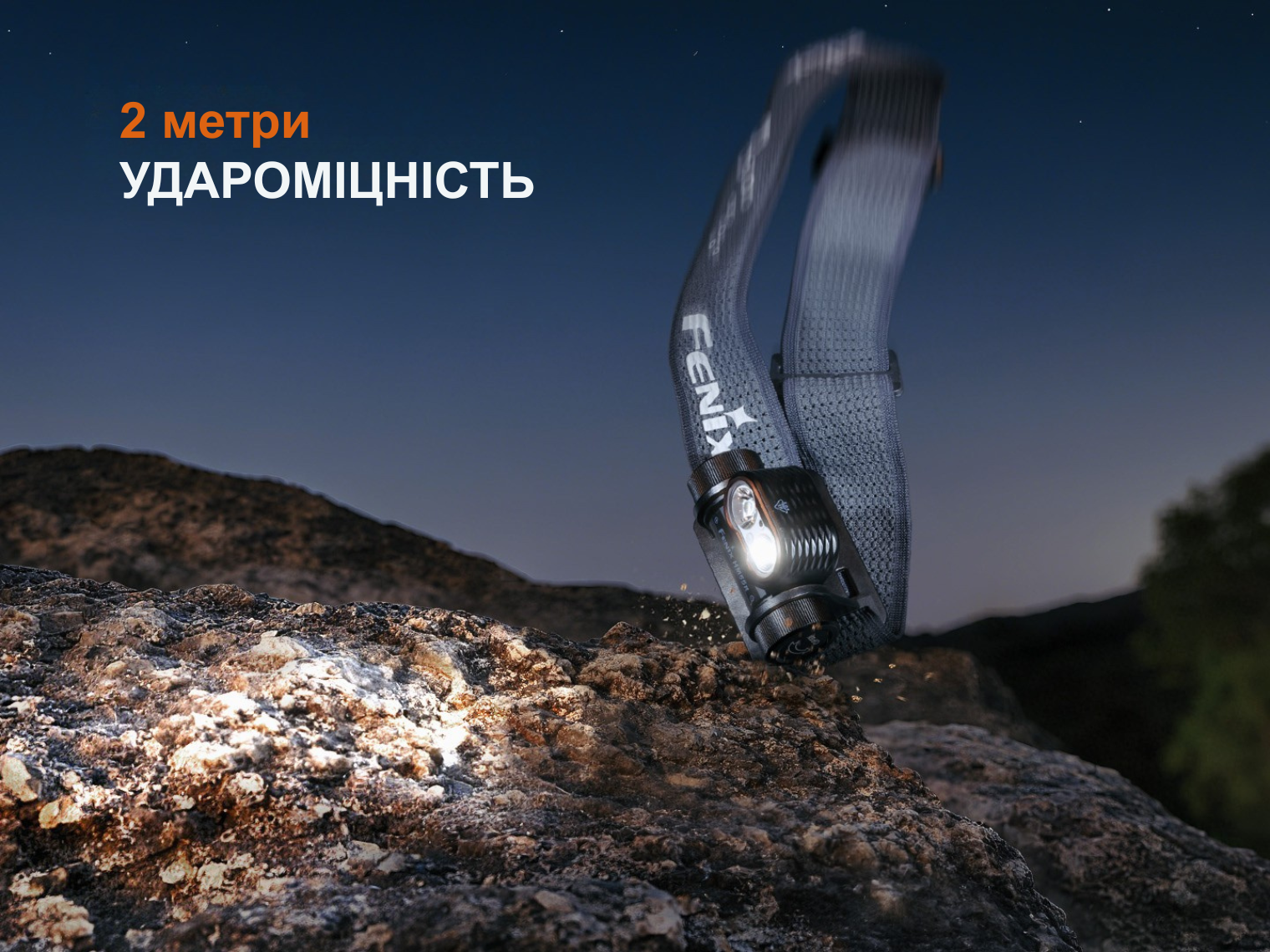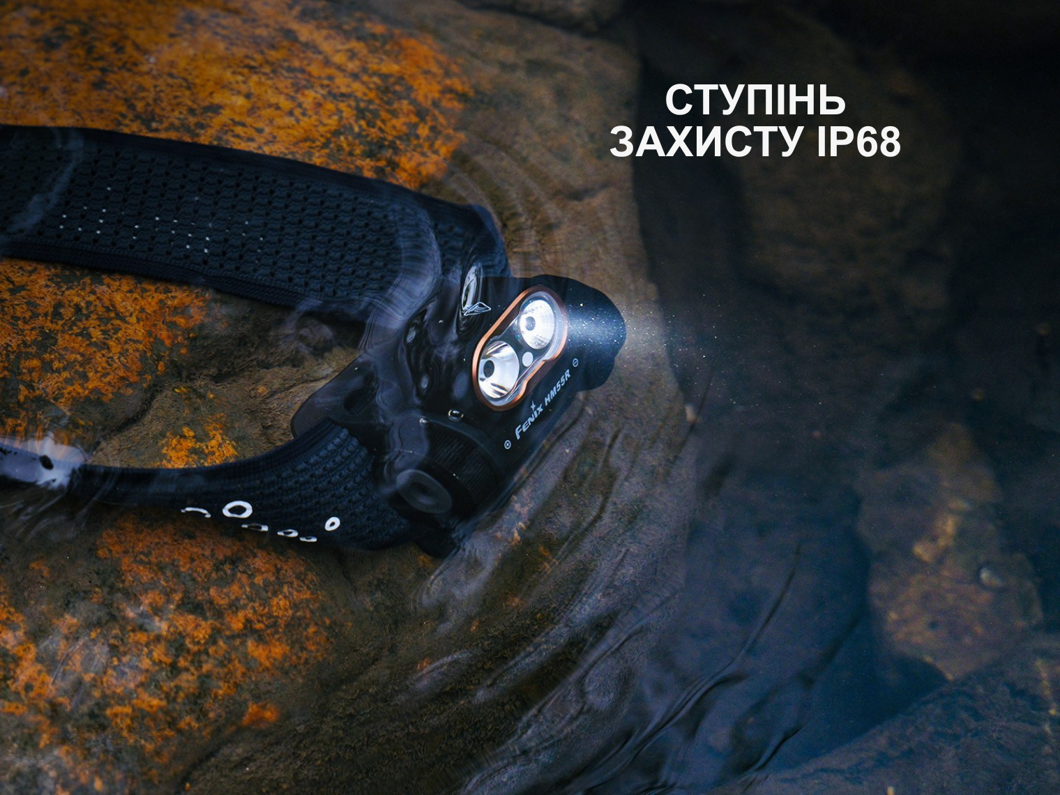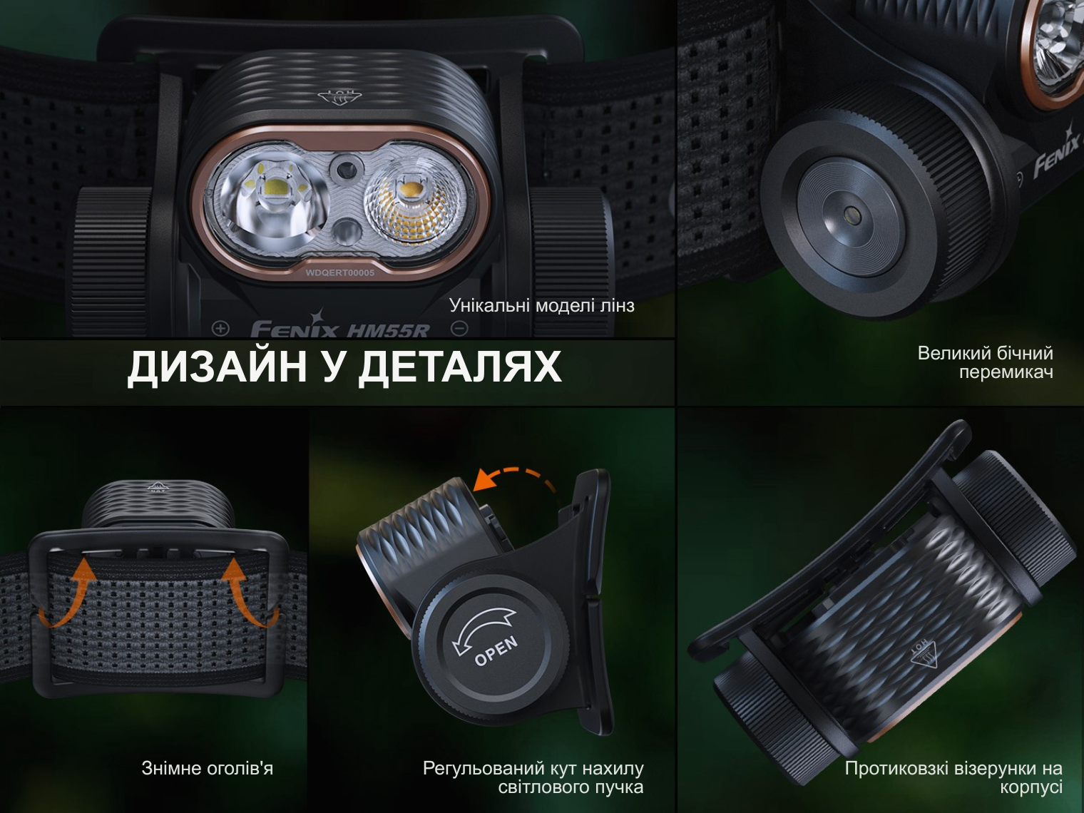 Налобний ліхтар Fenix HM55R укомплектований випромінювачами з колірною температурою 6500К та 5000К, а також червоним діодом. Максимальна яскравість променя сягає 1200 лм за дальності 175 м. Інтелектуальний датчик наближення автоматично знижує потужність у разі надто близького розміщення до освітлюваного об'єкта. Акумулятор 18350 заряджається через порт USB-C та забезпечує до 141 год роботи на одному заряді.
