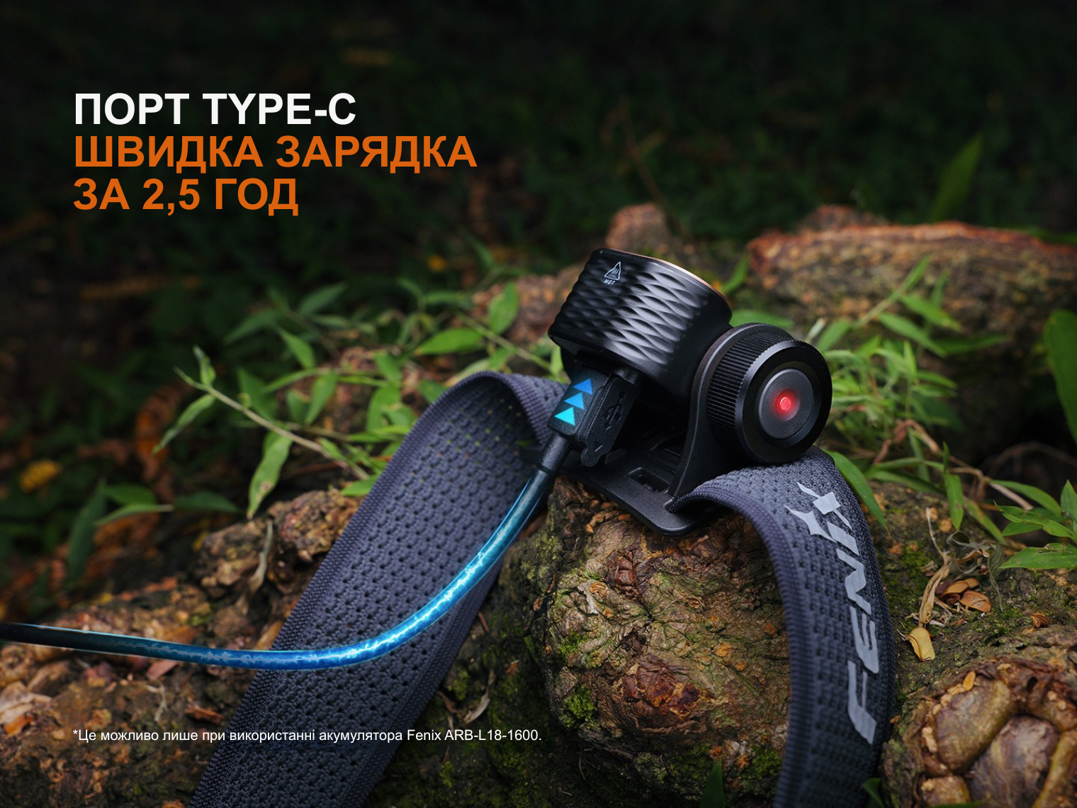 Ліхтар Fenix HM55R з резинкою на голову, акумулятор ARB-L18-1600, кабель USB-C для заряджання, запасне ущільнювальне кільце, інструкція користувача, гарантійний талон.