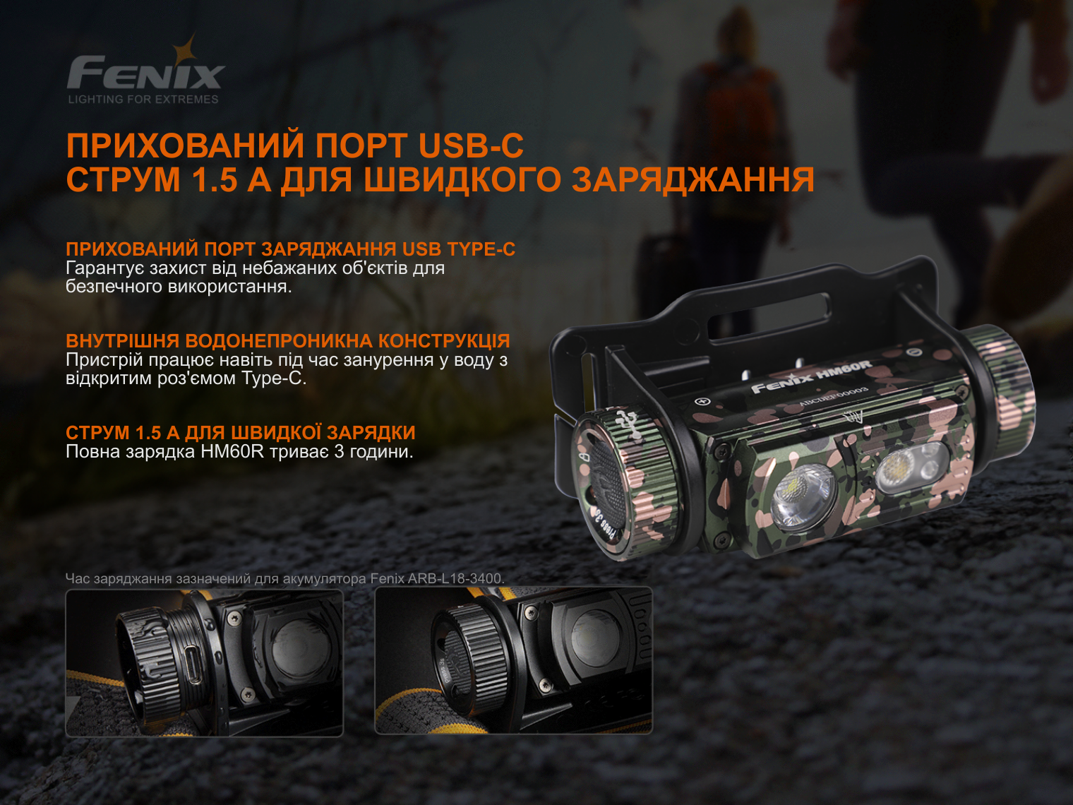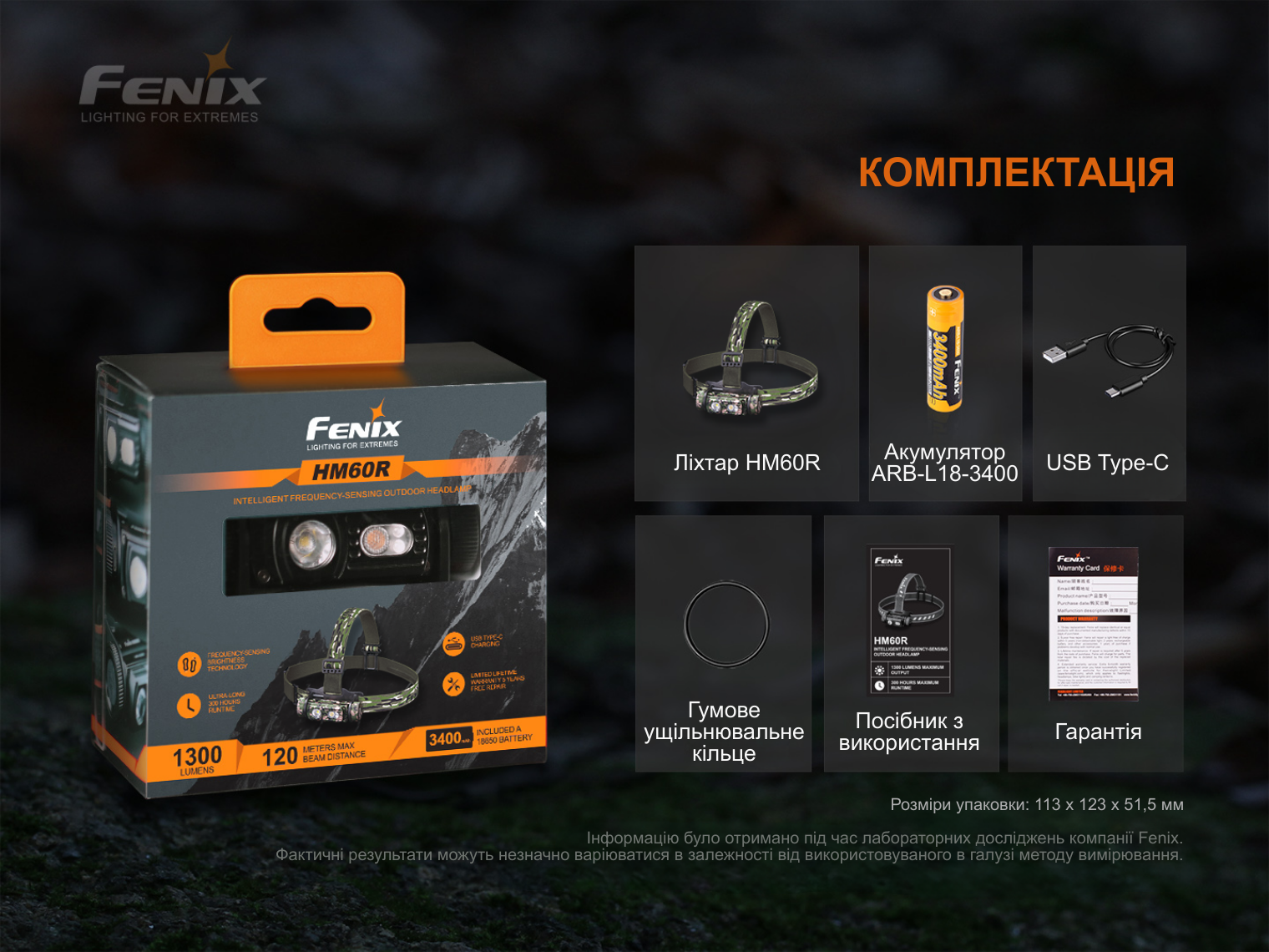 Ліхтар Fenix HM60R Camo, акумулятор ARB-L18-3400, кабель для зарядки USB Type-C, запасне ущільнювальне кільце, інструкція користувача, гарантійний талон.