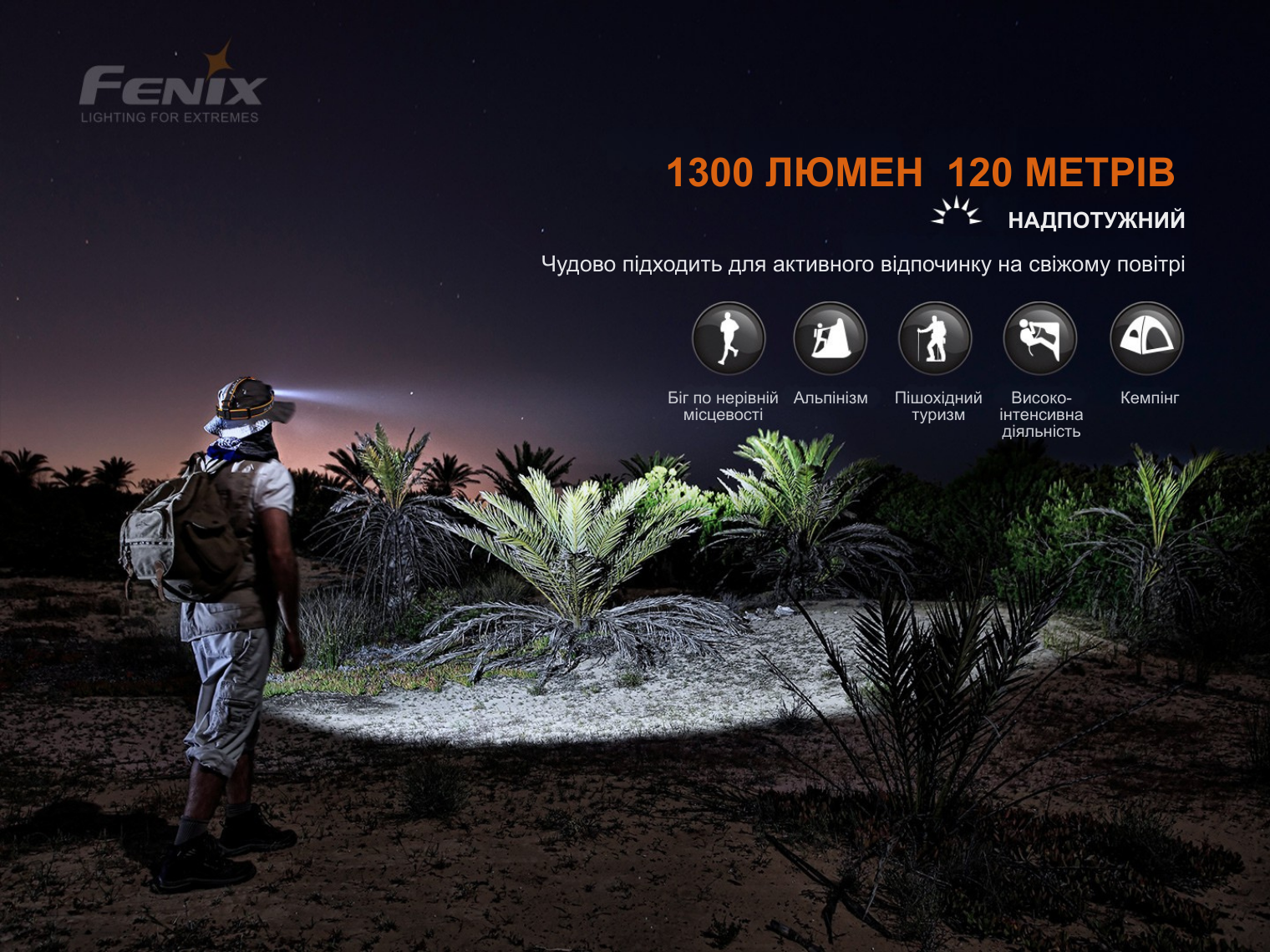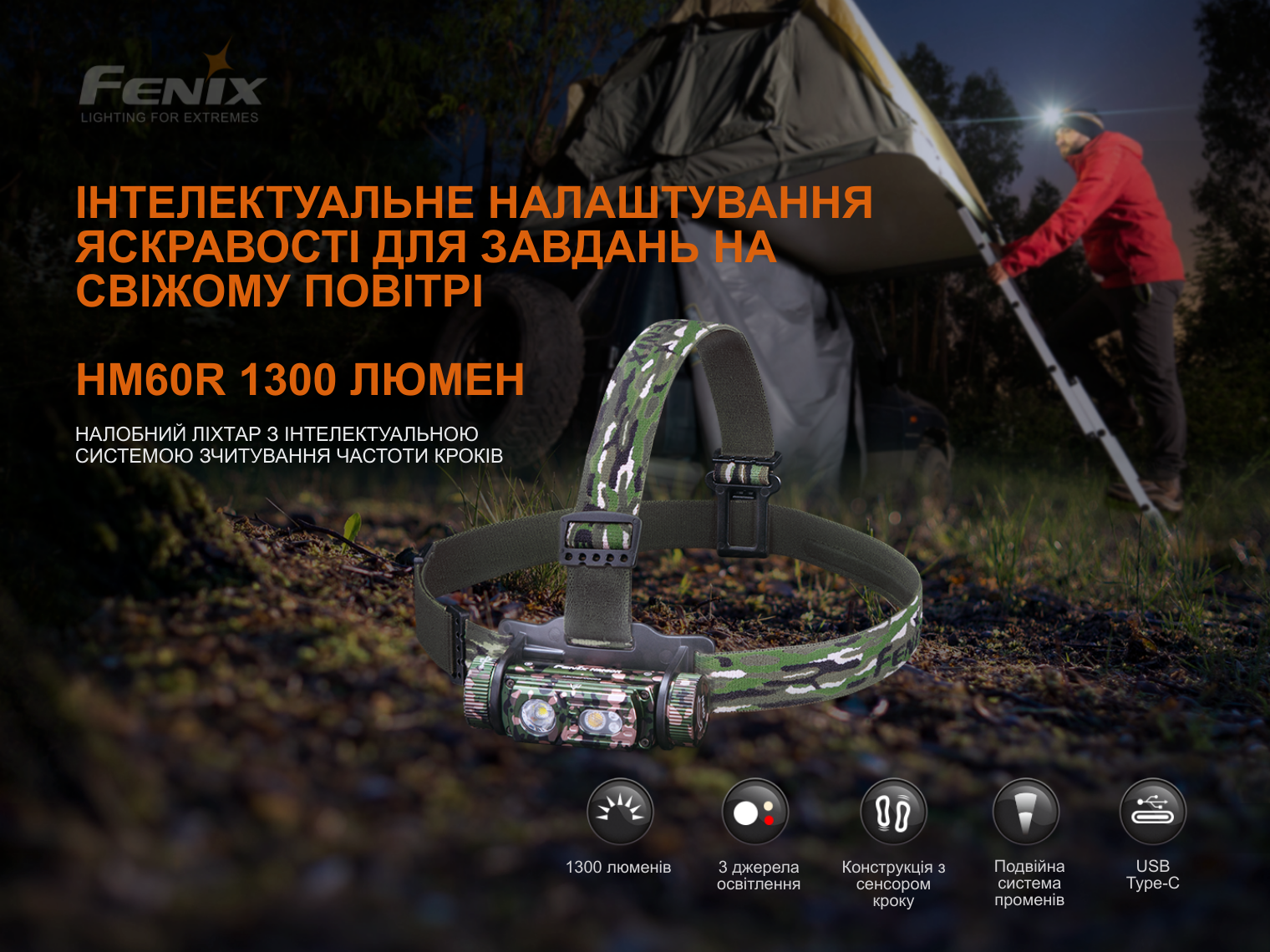 Fenix HM60R Camo — лімітоване професійне спорядження для завдань у польових умовах. Камуфляжне забарвлення корпусу та стрічки розроблене для військових і спецпідрозділів, де критично важливо зберігати маскування на фоні професійного екіпірування. Потужність 1300 лм, три типи світла та інтелектуальний сенсор частоти кроку забезпечують максимальну ефективність та непомітність у дикій природі.